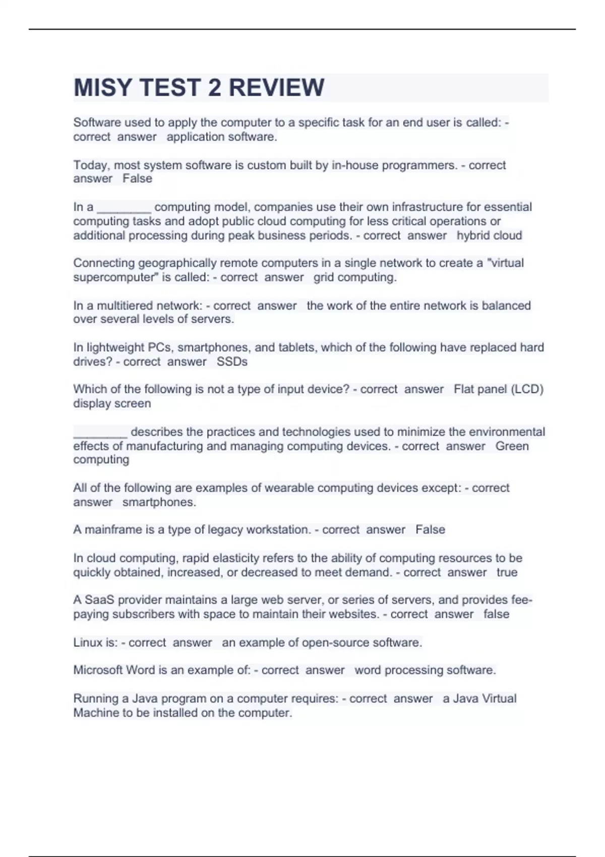MISY TEST 2 REVIEW Questions with complete solution 2023/2024Software used to apply the computer to a specific task for an end user is called: - correct answer application software. Today, most system software is custom built by in-house programmers. - correct answer False In a ________ computing model, companies use their own infrastructure for essential computing tasks and adopt public cloud computing for less critical operations or additional processing during peak business periods. - correct answer hybrid cloud Connecting geographically