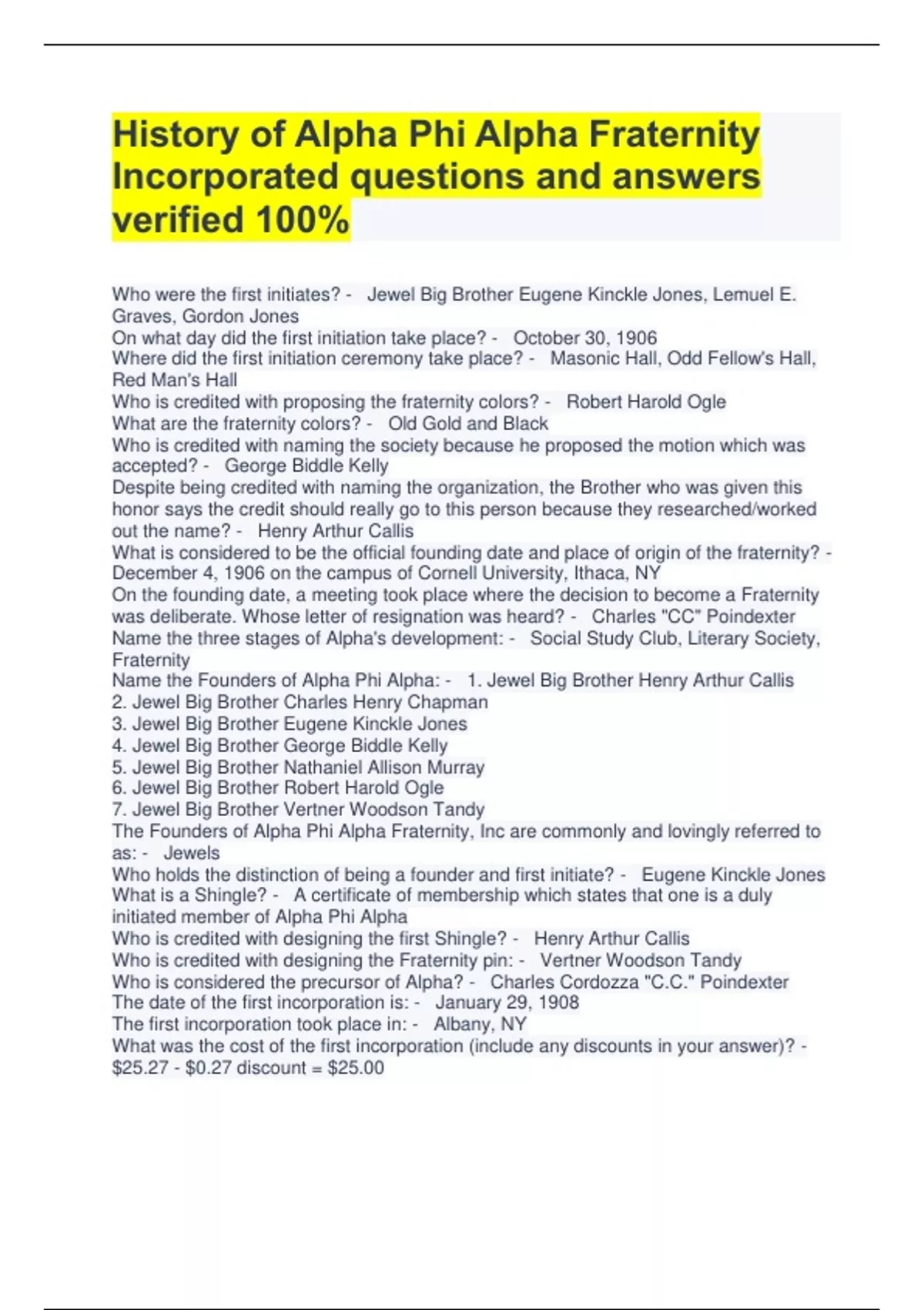 History of Alpha Phi Alpha Fraternity Incorporated questions and answers verified 100% Who were the first initiates? - Jewel Big Brother Eugene Kinckle Jones, Lemuel E. Graves, Gordon Jones On what day did the first initiation take place? - October 30, 1906 Where did the first initiation ceremony take place? - Masonic Hall, Odd Fellow's Hall, Red Man's Hall Who is credited with proposing the fraternity colors? - Robert Harold Ogle What are the fraternity colors? - Old Gold and Black Who is credited with naming the society because he proposed the motion which was accepted? - George Biddle Kelly Despite being credited with naming the organization, the Brother who was given this honor says the credit should really go to this person because they researched/worked out the name? - Henry Arthur Callis What is considered to be the official founding date and place of origin of the fraternity? - December 4, 1906 on the campus of Cornell University, Ithaca, NY On the founding date, a meeting took place where the decision to become a Fraternity was deliberate. Whose letter of resignation was heard? - Charles "CC" Poindexter Name the three stages of Al