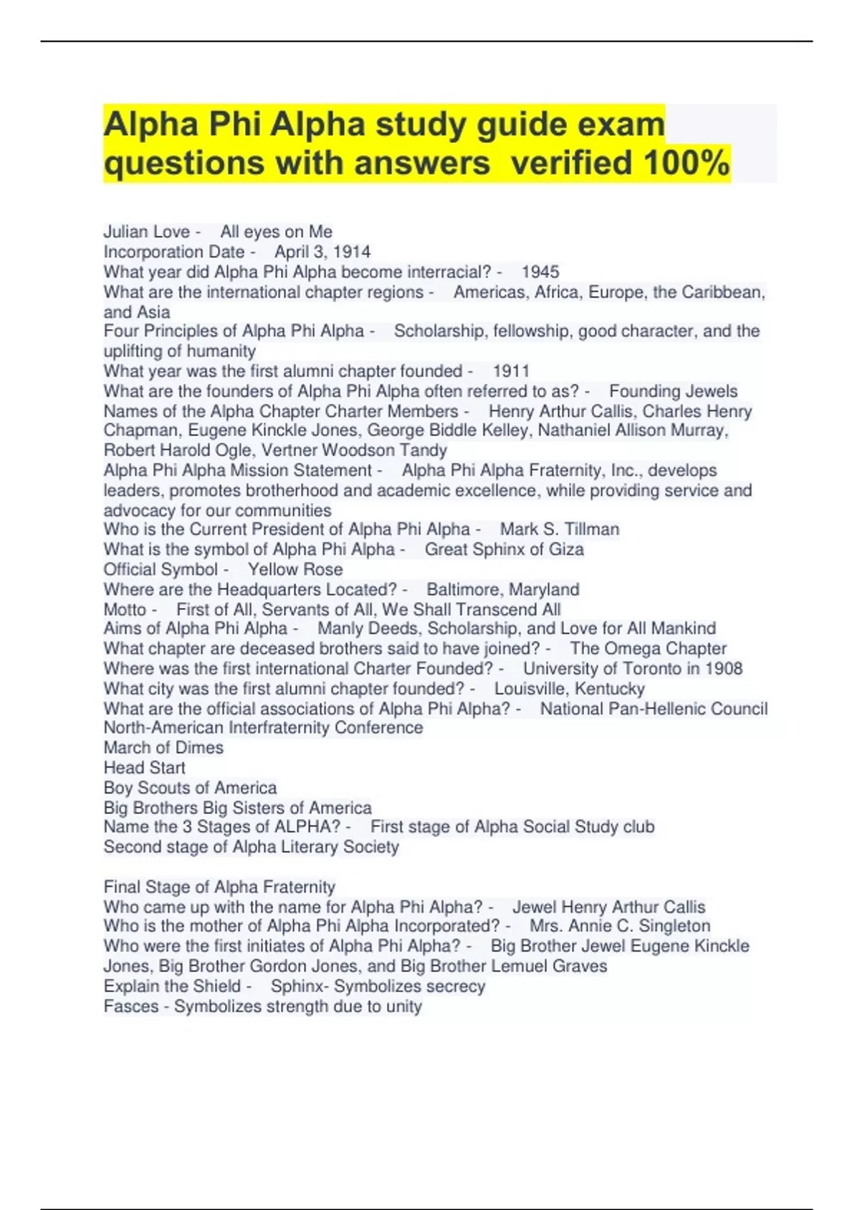 Alpha Phi Alpha study guide exam questions with answers verified 100% Julian Love - All eyes on Me Incorporation Date - April 3, 1914 What year did Alpha Phi Alpha become interracial? - 1945 What are the international chapter regions - Americas, Africa, Europe, the Caribbean, and Asia Four Principles of Alpha Phi Alpha - Scholarship, fellowship, good character, and the uplifting of humanity What year was the first alumni chapter founded - 1911 What are the founders of Alpha Phi Alpha often referred to as? - Founding Jewels Names of the Alpha Chapter Charter Members - Henry Arthur Callis, Charles Henry Chapman, Eugene Kinckle Jones, George Biddle Kelley, Nathaniel Allison Murray, Robert Harold Ogle, Vertner Woodson Tandy Alpha Phi Alpha Mission Statement - Alpha Phi Alpha Fraternity, Inc., develops leaders, promotes brotherhood and academic excellence, while providing service and advocacy for our communities Who is the Current President of Alpha Phi Alpha - Mark S. Tillman What is the symbol of Alpha Phi Alpha - Great Sphinx of Giza Official Symbol - Yellow Rose Where are the Headquarters Located? - Baltimore, Maryland Motto - First of All, Servants of All, We Shall Transcend All Aims of Alpha Phi Alpha - Manly Deeds, Scholarship, and Love for All Mankind What chapter are deceased brothers said to have joined? - The Omega Chapter Where was the first international Charter Founded? - University of Toronto in 1908 What city was the first alumni chapter founded? - Louisville, Kentucky What are the official associations of Alpha Phi Alpha? - National Pan-Hellenic Council North-American Interfraternity Conference March of Dimes Head Start Boy Scouts of America Big Brothers Big Sisters of America Name the 3 Stages of ALPHA? - First stage of Alpha Social Study club Second stage of Alpha Literary So