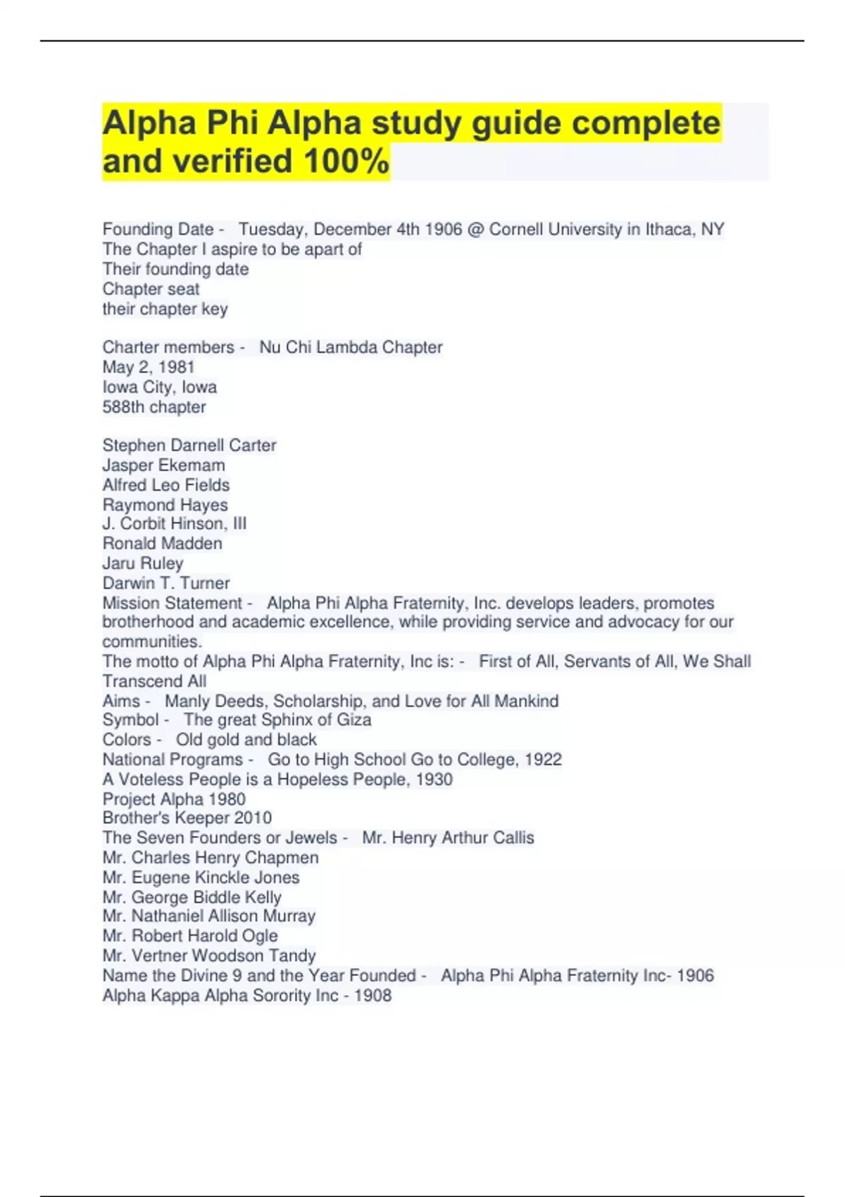 Alpha Phi Alpha study guide complete and verified 100% Founding Date - Tuesday, December 4th 1906 @ Cornell University in Ithaca, NY The Chapter I aspire to be apart of Their founding date Chapter seat their chapter key Charter members - Nu Chi Lambda Chapter May 2, 1981 Iowa City, Iowa 588th chapter Stephen Darnell Carter Jasper Ekemam Alfred Leo Fields Raymond Hayes J. Corbit Hinson, III Ronald Madden Jaru Ruley Darwin T. Turner Mission Statement - Alpha Phi Alpha Fraternity, Inc. develops leaders, promotes brotherhood and academic excellence, while providing service and advocacy for our communities. The motto of Alpha Phi Alpha Fraternity, Inc is: - First of All, Servants of All, We Shall Transcend All Aims - Manly Deeds, Scholarship, and Love for All Mankind Symbol - The great Sphinx of Giza Colors - Old gold and black National Programs - Go to High School Go to College, 1922 A Voteless People is a Hopeless People, 1930 Project Alpha 1980 Brother's Keeper 2010 The Seven Founders or Jewels - Mr. Henry Arthur Callis Mr. Charles Henry Chapmen Mr. Eugene Kinckle Jones Mr. George Biddle Kelly Mr. Nathaniel Allison Murray Mr. Robert Harold Ogle Mr. Vertner Woodson Tandy Name the Divine 9 and the Year Founded - Alpha Phi Alpha Fraternity Inc- 1906 Alpha Kappa Alpha Sorority In