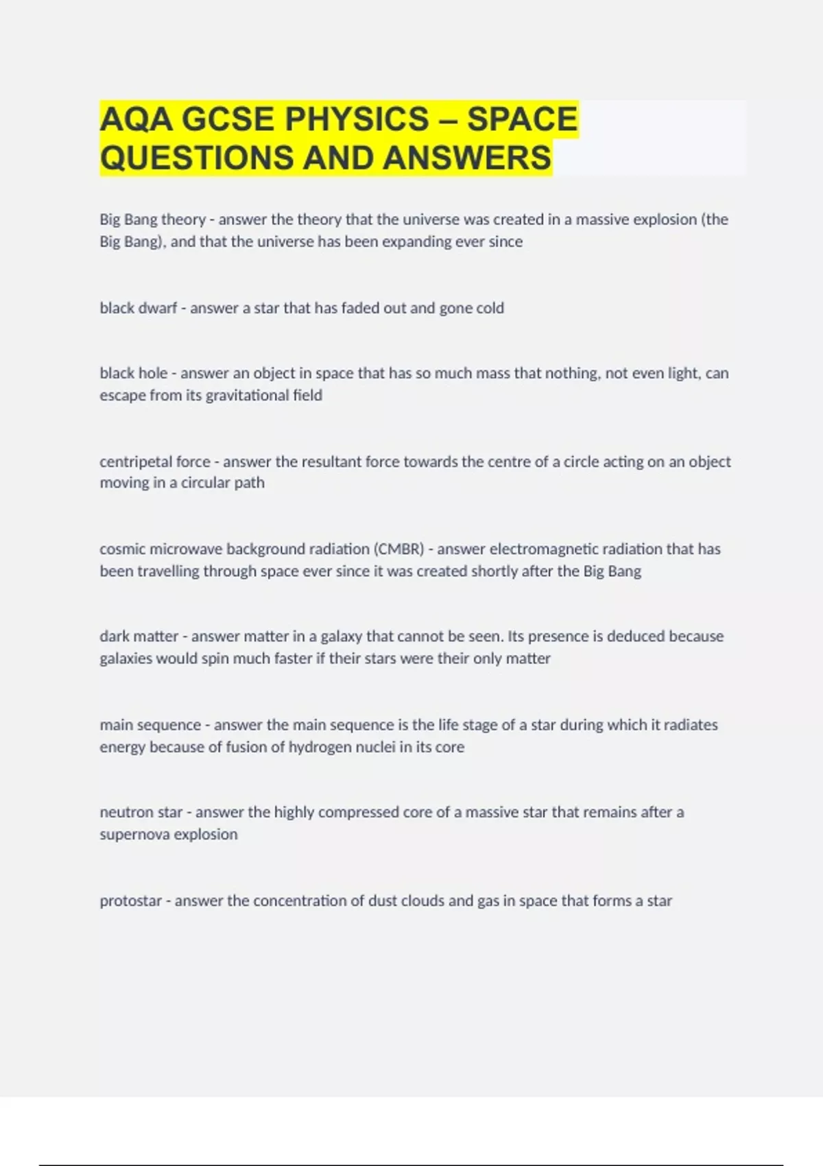AQA GCSE PHYSICS – SPACE QUESTIONS AND ANSWERS