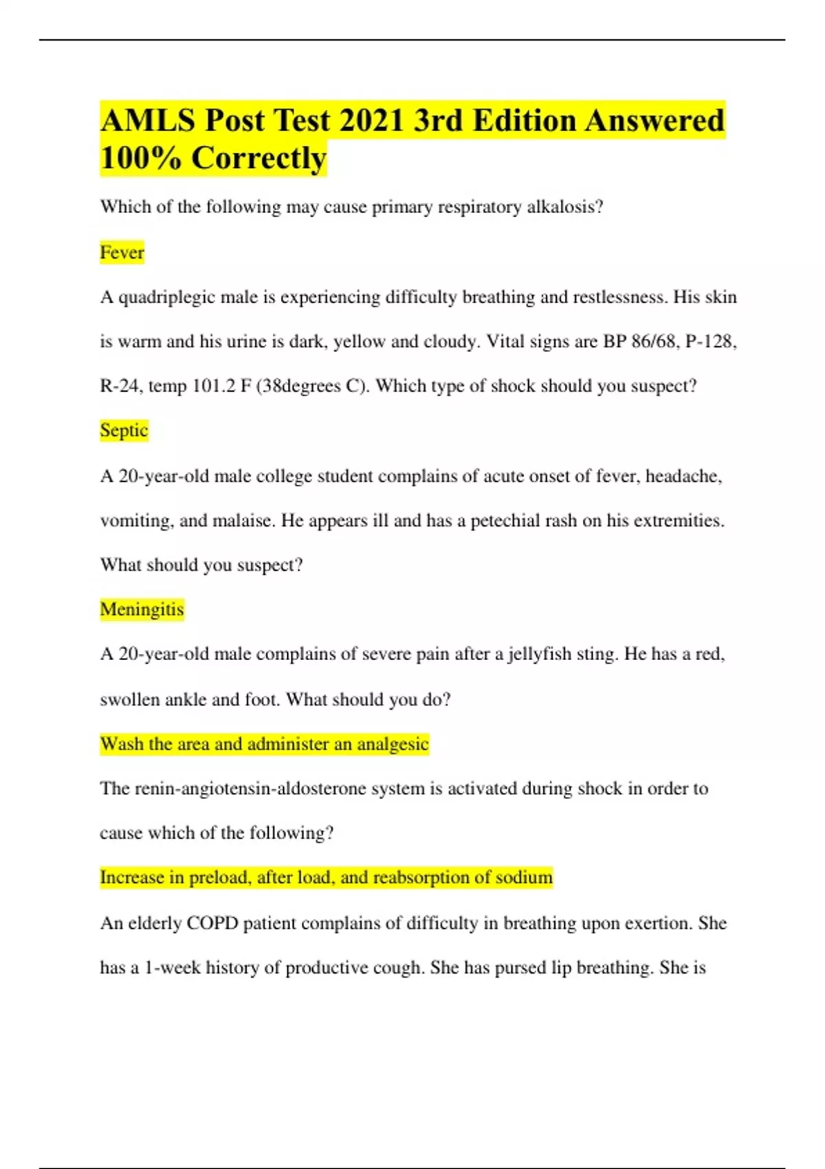 AMLS Post Test 2021 3rd Edition Answered 100% Correctly Which of the following may cause primary respiratory alkalosis? Fever A quadriplegic male is experiencing difficulty breathing and restlessness. His skin is warm and his urine is dark, yellow and cloudy. Vital signs are BP 86/68, P-128, R-24, temp 101.2 F (38degrees C). Which type of shock should you suspect? Septic A 20-year-old male college student complains of acute onset of fever, headache, vomiting, and malaise. He appears ill and has a petechial rash on his extremities. What should you suspect? Meningitis A 20-year-old male complains of severe pain after a jellyfish sting. He has a red, swollen ankle and foot. What should you do? Wash the area and administer an analgesic The renin-angiotensin-aldosterone system is activated during shock in order to cause which of the following? Increase in preload, after load, and reabsorption of sodium An elderly COPD patient complains of difficulty in breathing upon exertion. She has a 1-week history of productive cough. She has pursed lip breathing. She is prescribed a bronchodilator as needed. Vital signs are BP 132/70, P-88, R-20 with Rhonchi. What should you suspect? Epiglottitis An anxious 32-year-old female complains of chest pains with palpitations. She has a history of Grave's disease. She reports she was seen in the ED earlier that day and had a CT scan of her abdomen with IV contrast. She is diaphoretic and has a temperature of 101.5 F (38.6 C). Vital signs are BP-100/62, P-156, R-30, BGL 133mg/dL. What should you administer?