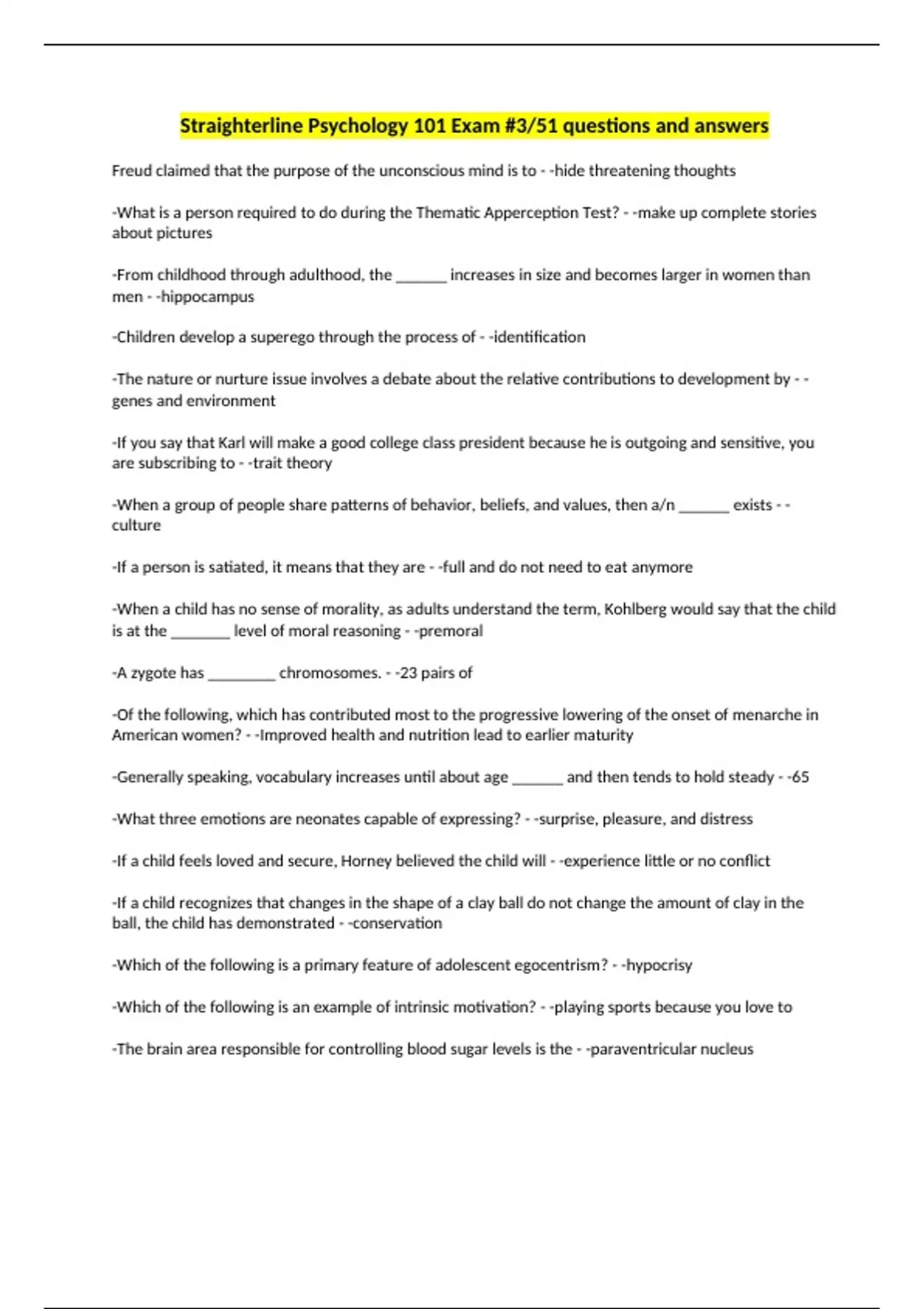 Straighterline Psychology 101 Exam #3/51 questions and answers
