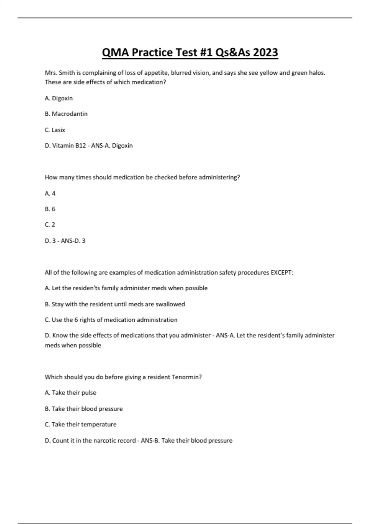 QMA Practice Test #1 Qs&As 2023 Mrs. Smith is complaining of loss of appetite, blurred vision, and says she see yellow and green halos. These are side effects of which medication? A. Digoxin B. Macrodantin C. Lasix D. Vitamin B12 - ANS-A. Digoxin How many times should medication be checked before administering? A. 4 B. 6 C. 2 D. 3 - ANS-D. 3 All of the following are examples of medication administration safety procedures EXCEPT: A. Let the residen'ts family administer meds when possible B. Stay with the resident until meds are swallowed C. Use the 6 rights of medication administration D. Know the side effects of medications that you administer - ANS-A. Let the resident's family administer meds when possible Which should you do before giving a resident Tenormin? A. Take their pulse B. Take their blood pressure C. Take their temperature D. Count it in the narcotic record - ANS-B. Take their blood pressure When taking a blood pressure, what is the first sound heard called?.. CONTINUES...