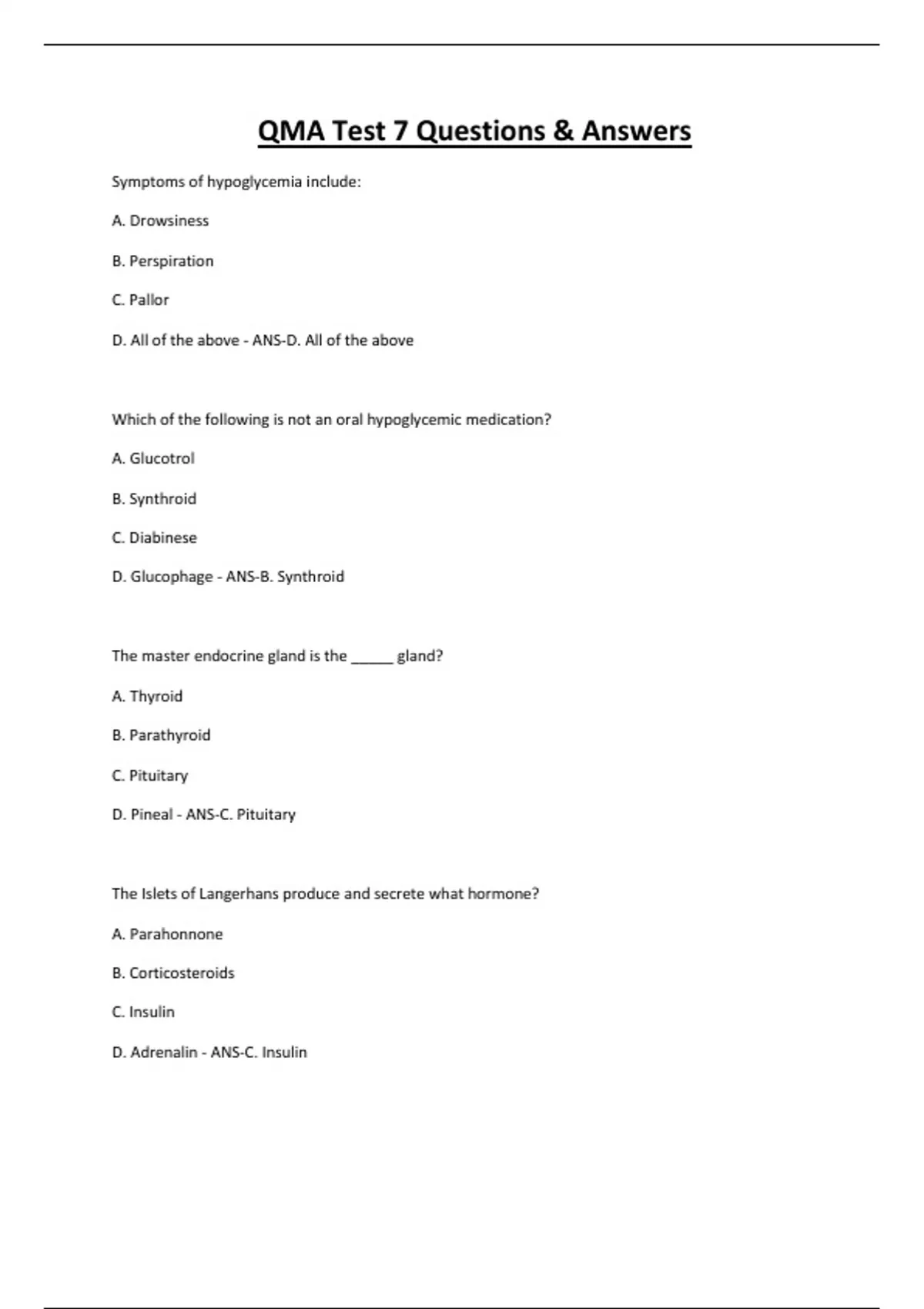 QMA Test 7 Questions & Answers Symptoms of hypoglycemia include: A. Drowsiness B. Perspiration C. Pallor D. All of the above - ANS-D. All of the above Which of the following is not an oral hypoglycemic medication? A. Glucotrol B. Synthroid C. Diabinese D. Glucophage - ANS-B. Synthroid The master endocrine gland is the _____ gland? A. Thyroid B. Parathyroid C. Pituitary D. Pineal - ANS-C. Pituitary The Islets of Langerhans produce and secrete what hormone?