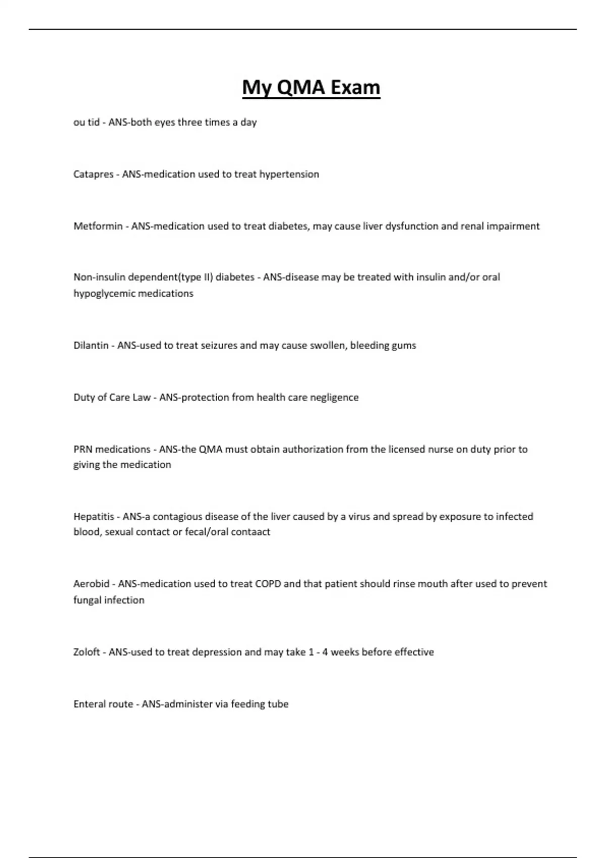 My QMA Exam ou tid - ANS-both eyes three times a day Catapres - ANS-medication used to treat hypertension Metformin - ANS-medication used to treat diabetes, may cause liver dysfunction and renal impairment Non-insulin dependent(type II) diabetes - ANS-disease may be treated with insulin and/or oral hypoglycemic medications Dilantin - ANS-used to treat seizures and may cause swollen, bleeding gums Duty of Care Law - ANS-protection from health care negligence PRN medications - ANS-the QMA must obtain authorization from the licensed nurse on duty prior to giving the medication Hepatitis - ANS-a contagious disease of the liver caused by a virus and spread by exposure to infected blood, sexual contact or fecal/oral contaact Aerobid - ANS-medication used to treat COPD and that patient should rinse mouth after used to prevent fungal infection Zoloft - ANS-used to treat depression and may take 1 - 4 weeks before effective Enteral route - ANS-administer via feeding tube Continues...