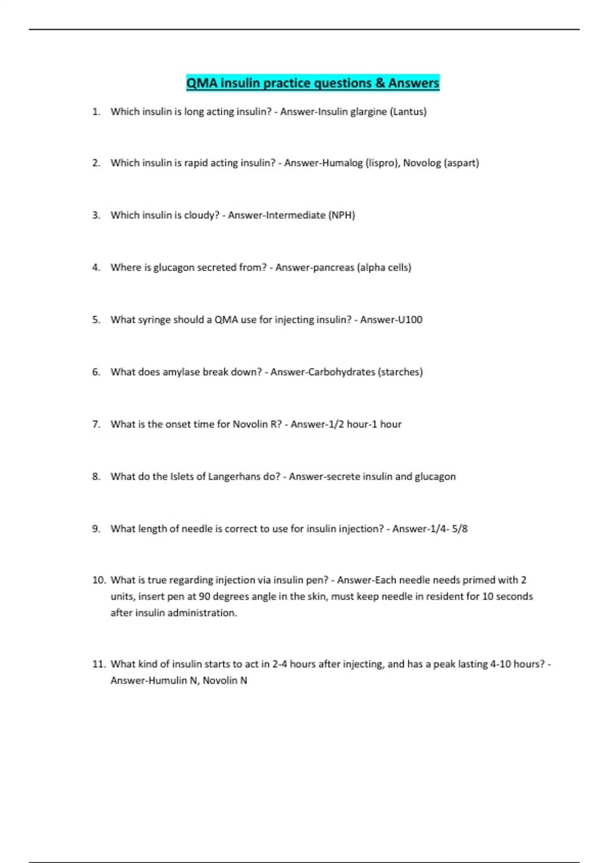 QMA insulin practice questions & Answers 1. Which insulin is long acting insulin? - Answer-Insulin glargine (Lantus) 2. Which insulin is rapid acting insulin? - Answer-Humalog (lispro), Novolog (aspart) 3. Which insulin is cloudy? - Answer-Intermediate (NPH) 4. Where is glucagon secreted from? - Answer-pancreas (alpha cells) 5. What syringe should a QMA use for injecting insulin? - Answer-U100 6. What does amylase break down? - Answer-Carbohydrates (starches) 7. What is the onset time for Novolin R? - Answer-1/2 hour-1 hour 8. What do the Islets of Langerhans do? - Answer-secrete insulin and glucagon 9. What length of needle is correct to use for insulin injection? - Answer-1/4- 5/8 10. What is true regarding injection via insulin pen? - Answer-Each needle needs primed with 2 units, insert pen at 90 degrees angle in the skin, must keep needle in resident for 10 seconds after insulin administration. 11. What kind of insulin starts to act in 2-4 hours after injecting, and has a peak lasting 4-10 hours? - Continues...