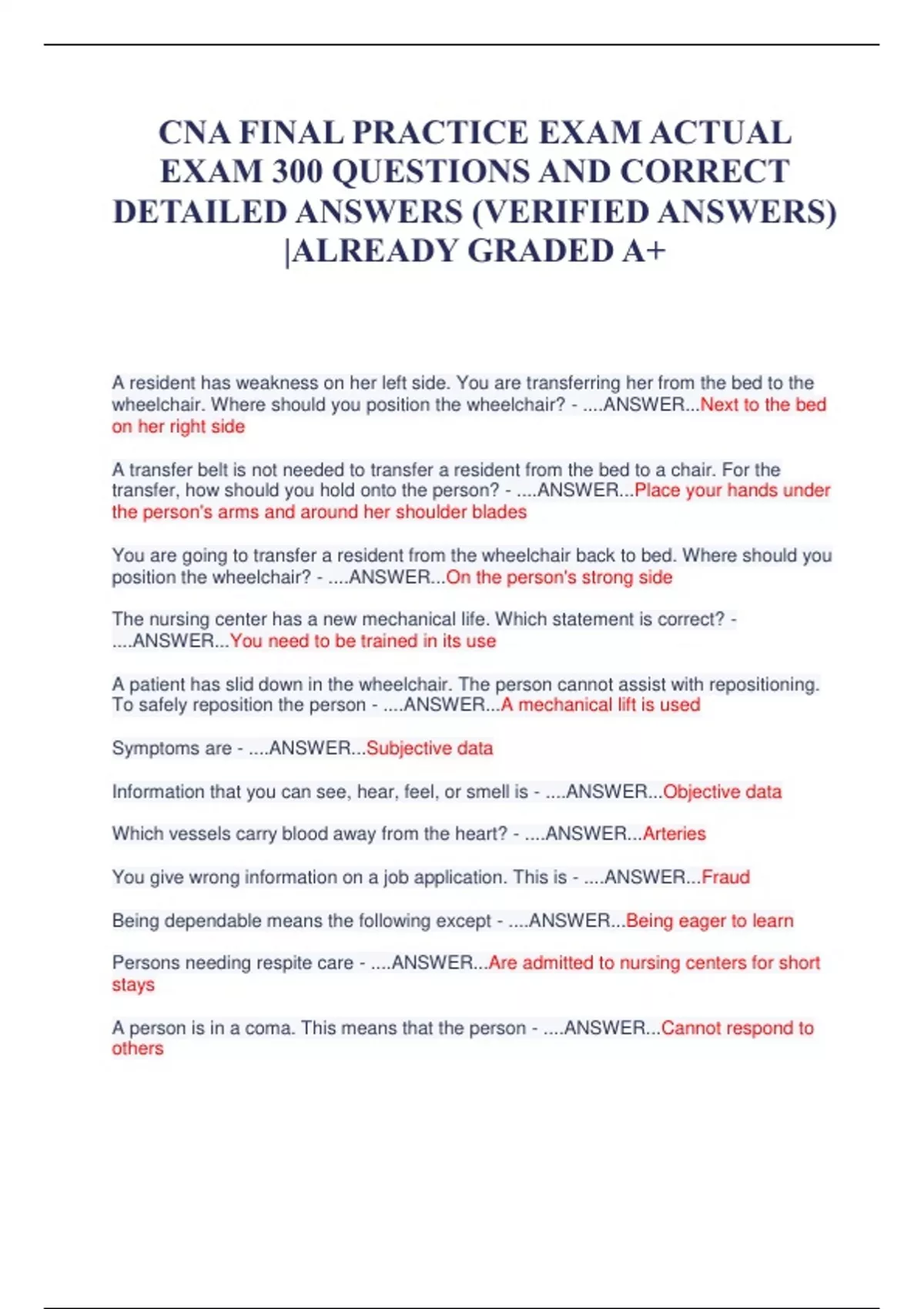 CNA FINAL PRACTICE EXAM ACTUAL EXAM 300 QUESTIONS AND CORRECT DETAILED ANSWERS (VERIFIED ANSWERS) |ALREADY GRADED A+