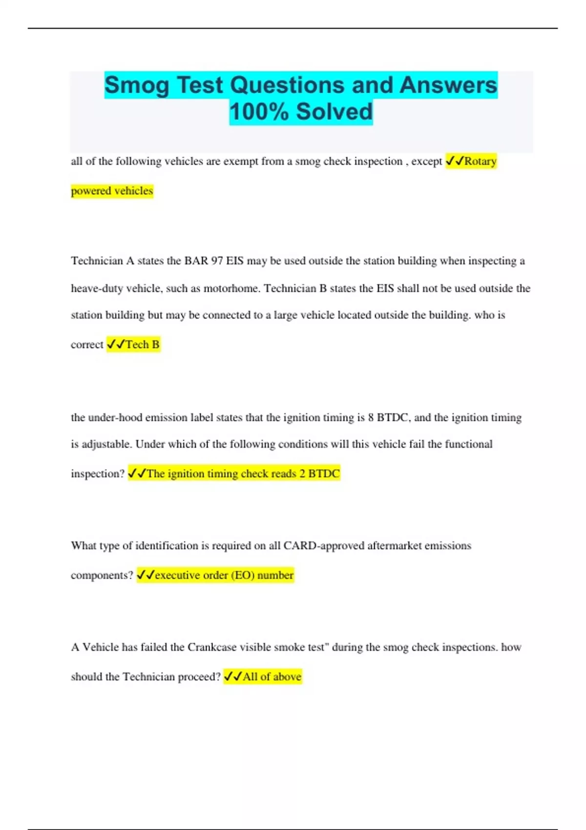 Smog Test Questions and Answers 100% Solved all of the following vehicles are exempt from a smog check inspection , except Rotary powered vehicles Technician A states the BAR 97 EIS may be used outside the station building when inspecting a heave-duty vehicle, such as motorhome. Technician B states the EIS shall not be used outside the station building but may be connected to a large vehicle located outside the building. who is correct Tech B the under-hood emission label states that the ignition timing is 8 BTDC, and the ignition timing is adjustable. Under which of the following conditions will this vehicle fail the functional inspection? The ignition timing check reads 2 BTDC What type of identification is required on all CARD-approved aftermarket emissions components? executive order (EO) number A Vehicle has failed the Crankcase visible smoke test" during the smog check inspections. how should the Technician proceed? All of above a Technician is going the conduct the visual inspection portion of the smog check inspection. upon opening the hood, he/she notices the vehicle has no under-hood label present. what action should the technician take as result of this finding? Use the ECS manual or BARD approved reference material to determine the emission components for the vehicle the under hood emissions label states that ignition timing is "non-adjustable" the label also reads that timing specification is 12 BTDC. What is the correct procedure to follow? Enter the timing as "not applicable" (N/A) A vehicle arrives for a smog check inspection. While running the Tailpipe Emission portion of the inspection, the MIL light comes on. Which step should the Technician follow? Enter "pass" during the MIL Functional Test if the MIL operates correctly when prompted by the BAR-97 EIS during the Visual inspection, the Technician notices that the vehicle has a non-OEM aftermarket carburetor installed. What is the correct procedure the inspect this vehicle? Check to see if the carburetor is approved as the street-legal replacement part Which of these model year vehicle must receive a low-pressure Evaporative Test(LPFET) Model year 1995 and older