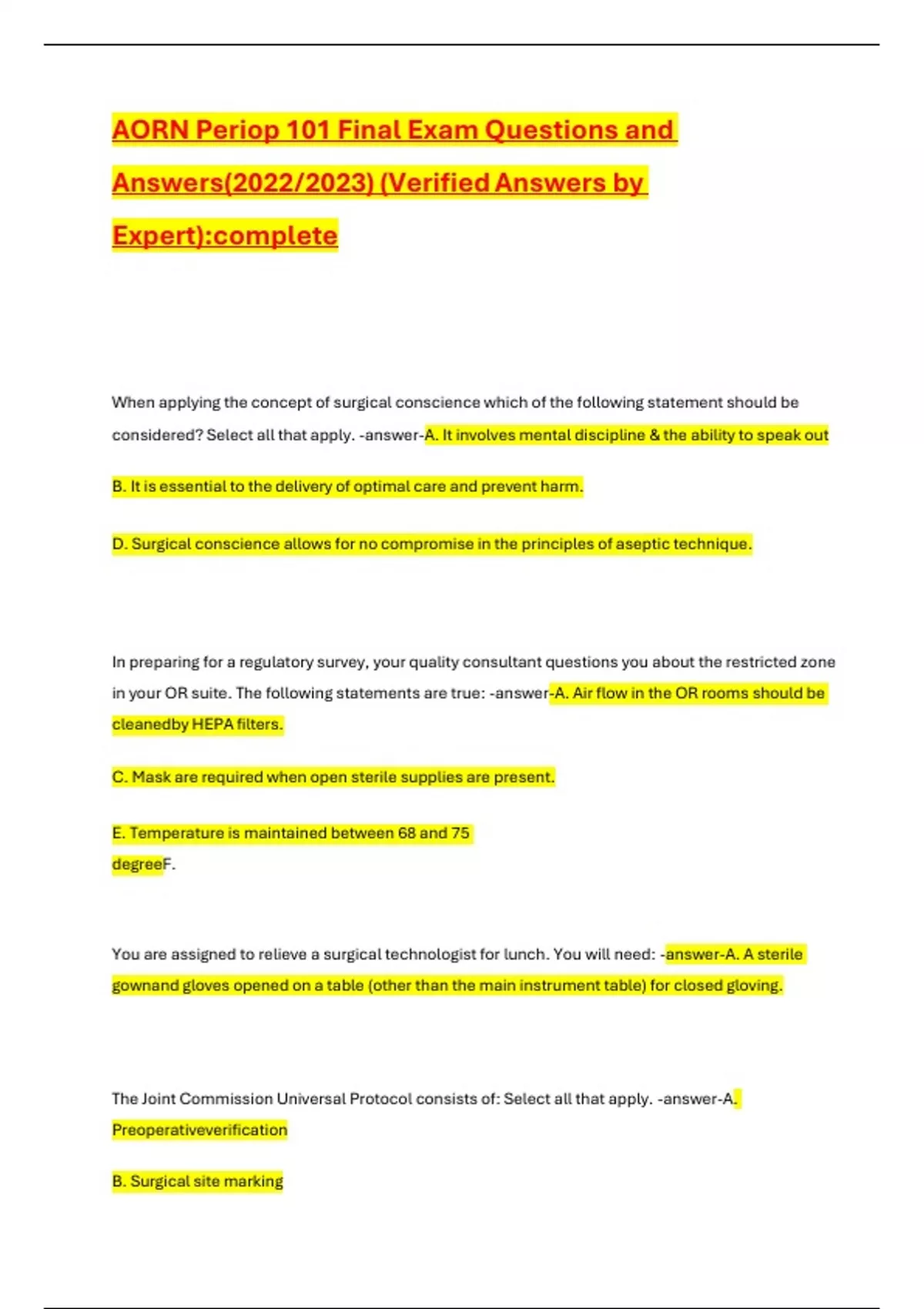 AORN Periop 101 Final Exam Questions and Answers (2022/2023) (Verified Answers by Expert):complete
