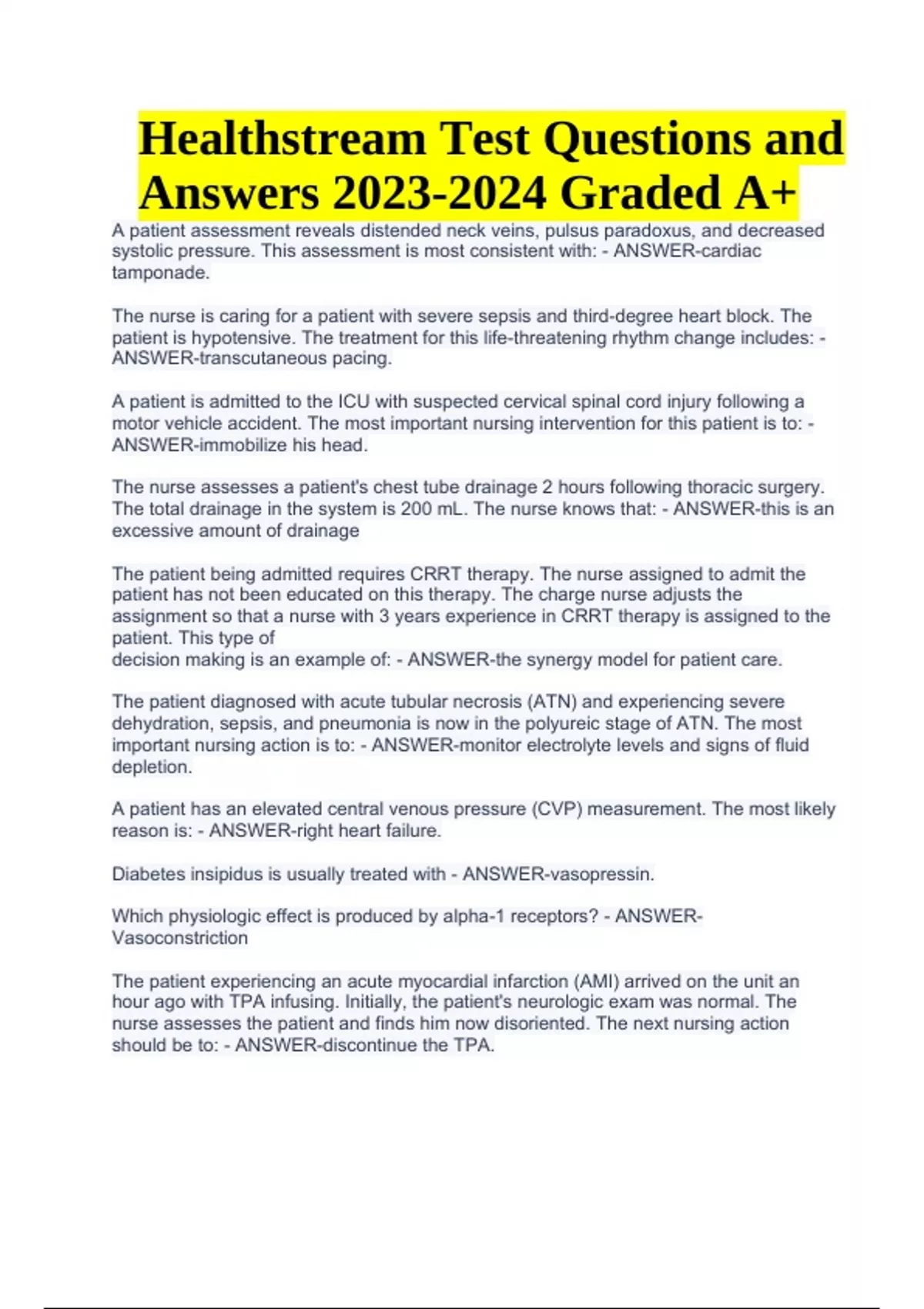 Healthstream Test Practice Questions and Answers Latest (Graded A+). The nurse is caring for a patient with severe sepsis and third-degree heart block. The patient is hypotensive. The treatment for this life-threatening rhythm change includes: - ANSWER-transcutaneous pacing. A patient is admitted to the ICU with suspected cervical spinal cord injury following a motor vehicle accident. The most important nursing intervention for this patient is to: - ANSWER-immobilize his head. The nurse assesses a patient's chest tube drainage 2 hours following thoracic surgery. The total drainage in the system is 200 mL. The nurse knows that: - ANSWER-this is an excessive amount of drainage The patient being admitted requires CRRT therapy. The nurse assigned to admit the patient has not been educated on this therapy. The charge nurse adjusts the assignment so that a nurse with 3 years experience in CRRT therapy is assigned to the patient. This type of decision making is an example of: - ANSWER-the synergy model for patient care. The patient diagnosed with acute tubular necrosis (ATN) and experiencing severe dehydration, sepsis, and pneumonia is now in the polyureic stage of ATN. The most important nursing action is to: - ANSWER-monitor electrolyte levels and signs of fluid depletion. A patient has an elevated central venous pressure (CVP) measurement. The most likely reason is: - ANSWER-right heart failure. Diabetes insipidus is usually treated with - ANSWER-vasopressin. Which physiologic effect is produced by alpha-1 receptors? - ANSWERVasoconstriction The patient experiencing an acute myocardial infarction (AMI) arrived on the unit an hour ago with TPA infusing. Initially, the patient's neurologic exam was normal. The nurse assesses the patient and finds him now disoriented. The next nursing action should be to: - ANSWER-discontinue the TPA. Healthstream Test Questions and Answers Graded A+ A patient has cardiomyopathy and is unstable. The nurse understands that the treatment goal is to improve contractility, reduce preload and reduce afterload. The nurse anticipates that medication management will include: - ANSWER-dobutamine and nitroprusside infusions A continuous drip of a medication is ordered at a rate of 2 mg/min. The standard mixture of this medication to yield a final concentration of 2 mg/mL is 1 g of the medication in 500 mL of IV fluid. At what rate in milliliters per hour should the IV pump be set? - ANSWER-60 mL/hr A practitioner has ordered 700 mg of an antibiotic. The medication label states, "Add 5 mL sterile water to 1 g of this medication; 0.5 g = 2 mL." How many milliliters should be given? - ANSWER-2.8 mL A practitioner order is written for a continuous infusion of insulin at 3 units/hr; the premixed solution is composed of 100 units of regular U-100 insulin in 100 mL normal saline. At which rate should the infusion run? - ANSWER-3 ml/hr A dose of 35 mg of a corticosteroid is ordered to be given IM to treat inflammation. The medication is available as 250 mg/10 mL. How many milliliters should be administered? - ANSWER-1.4 ml A practitioner's order prescribes levothyroxine 0.075 mg PO daily. The available medication is levothyroxine 25-mcg tablets. What will the nurse administer? - ANSWER3 tabs The actions of nitroglycerin in the management of angina include - ANSWER-coronary artery dilation and peripheral venous dilation. The most common cause of right heart failure is: - ANSWER-left heart failure. The nurse is differentiating between right- and left-sided heart failure in an assigned patient. For right-sided heart failure, the patient presents with edematous extremities, nausea/vomiting, and: - ANSWER-anorexia. The nurse is assigned to a patient with acute adrenal insufficiency (Addisonian crisis). The practitioner orders the steroids to be discontinued quickly. The nurse knows to question the order because: - ANSWER-steroids should be withdrawn slowly to allow for pituitary production of ACTH The nurse is caring for a patient who has atrial fibrillation. The patient is attempting to understand why this dysrhythmia developed in him. The nurse educates this patient about his risk factors, including: - ANSWER-diabetes mellitus. The nurse is assigned a patient who is experiencing chest pain resulting from coronary artery spasms while at rest. The nurse quickly realizes that the patient is suffering from: - ANSWER-variant (Prinzmetal's) angina. A blood transfusion is: indicated in cases of - ANSWER-active hemorrhage resulting in shock Prior to administering digoxin to a patient, the nurse assesses the: - ANSWER-apical pulse for 1 minute.