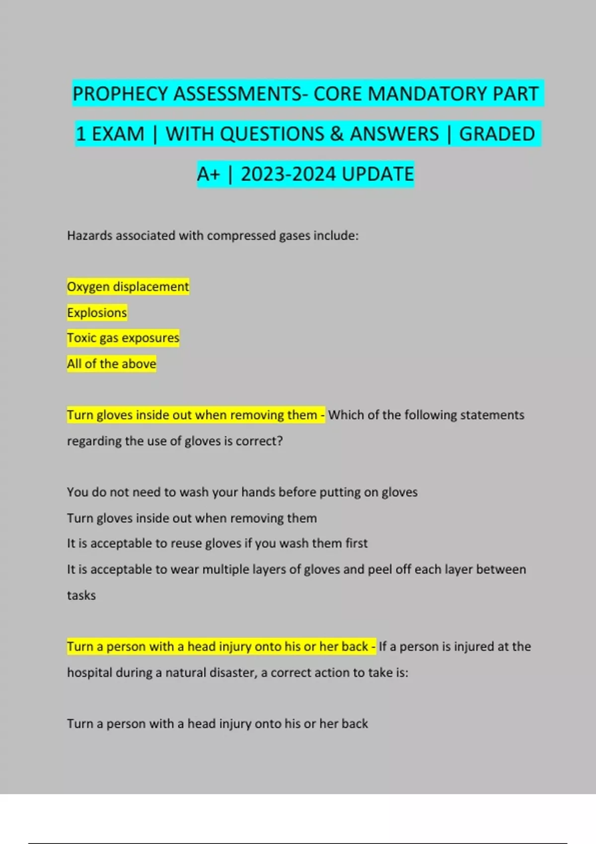 PROPHECY ASSESSMENTS- CORE MANDATORY PART 1 EXAM | WITH QUESTIONS & ANSWERS | GRADED A+ | UPDATE Hazards associated with compressed gases include: Oxygen displacement Explosions Toxic gas exposures All of the above Turn gloves inside out when removing them - Which of the following statements regarding the use of gloves is correct? You do not need to wash your hands before putting on gloves Turn gloves inside out when removing them It is acceptable to reuse gloves if you wash them first It is acceptable to wear multiple layers of gloves and peel off each layer between tasks Turn a person with a head injury onto his or her back - If a person is injured at the hospital during a natural disaster, a correct action to take is: Turn a person with a head injury onto his or her bac