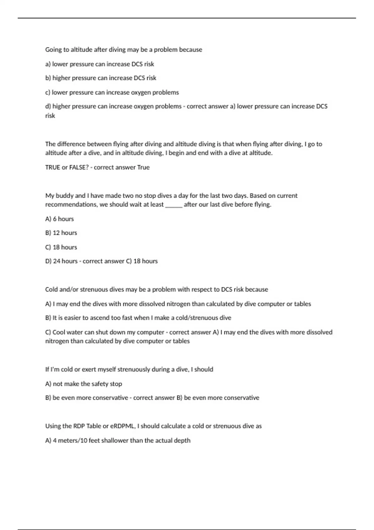 PADI - Section 5 Knowledge CheckGoing to altitude after diving may be a problem because a) lower pressure can increase DCS risk b) higher pressure can increase DCS risk c) lower pressure can increase oxygen problems d) higher pressure can increase oxygen problems - correct answer a) lower pressure can increase DCS risk The difference between flying after diving and altitude diving is that when flying after diving, I go to altitude after a dive, and in altitude diving, I begin and end with a dive at altitude. TRUE or FALSE? - correct answer True My buddy and I have made two no stop dives a day for the last two days. Based on current recommendations, we should wait at least _____ after our last dive before flying. A) 6 hours B) 12 hours C) 18 hours D) 24 hours - correct answer C) 18 hours Cold and/or strenuous dives may be a problem with respect to DCS risk because A) I may end the dives with more dissolved nitrogen than calculated by dive computer or tables B) It is easier to ascend too fast when I make a cold/strenuous dive C) Cool water can shut down my computer - correct answer A) I may end the dives with more dissolved nitrogen than calculated by dive computer or tables If I'm cold or exert myself strenuously during a dive, I should A) not make the safety stop B) be even more conservative - correct answer B) be even more conservative Using the RDP Table or eRDPML, I should calculate a cold or strenuous dive as A) 4 meters/10 feet shallower than the actual depth B) 4 meters/10 feet deeper than the actual depth C) having no surface interval D) requiring emergency decompression - correct answer B) 4 meters/10 feet deeper than the actual depth I would find a minimum surface interval when, after a dive, I want to know how long the _____ would be. A) no stop time and depth for the next dive B) time at the surface - correct answer B) time at the surface One way to find a minimum surface interval with a computer is to periodically check the no stop times for the depth you want, between dives. TRUE or FALSE? - correct answer TRUE I can use the RDP Table or eRDPML to find the exact time my dive computer requires for a minimum surface interval. TRUE or FALSE? - correct answer FALSE If I go over a no stop limit, I A) must surface at avery slow rate B) will have to make one or more emergency decompression stops - correct answer B) will have to make one or more emergency decompression stops The depths and times of emergency decompression stops are A) given by my dive computer B) standardized at 6 meters/20 feet and 3 meters/10 feet for 3 minutes C) Not important, as long as I make the stops - correct answer A) given by my dive computer If I surface without making an emergency decompression stop, I should get a fresh cylinder of air and then go back underwater to make the stop. TRUE or FALSE? - correct answer False
