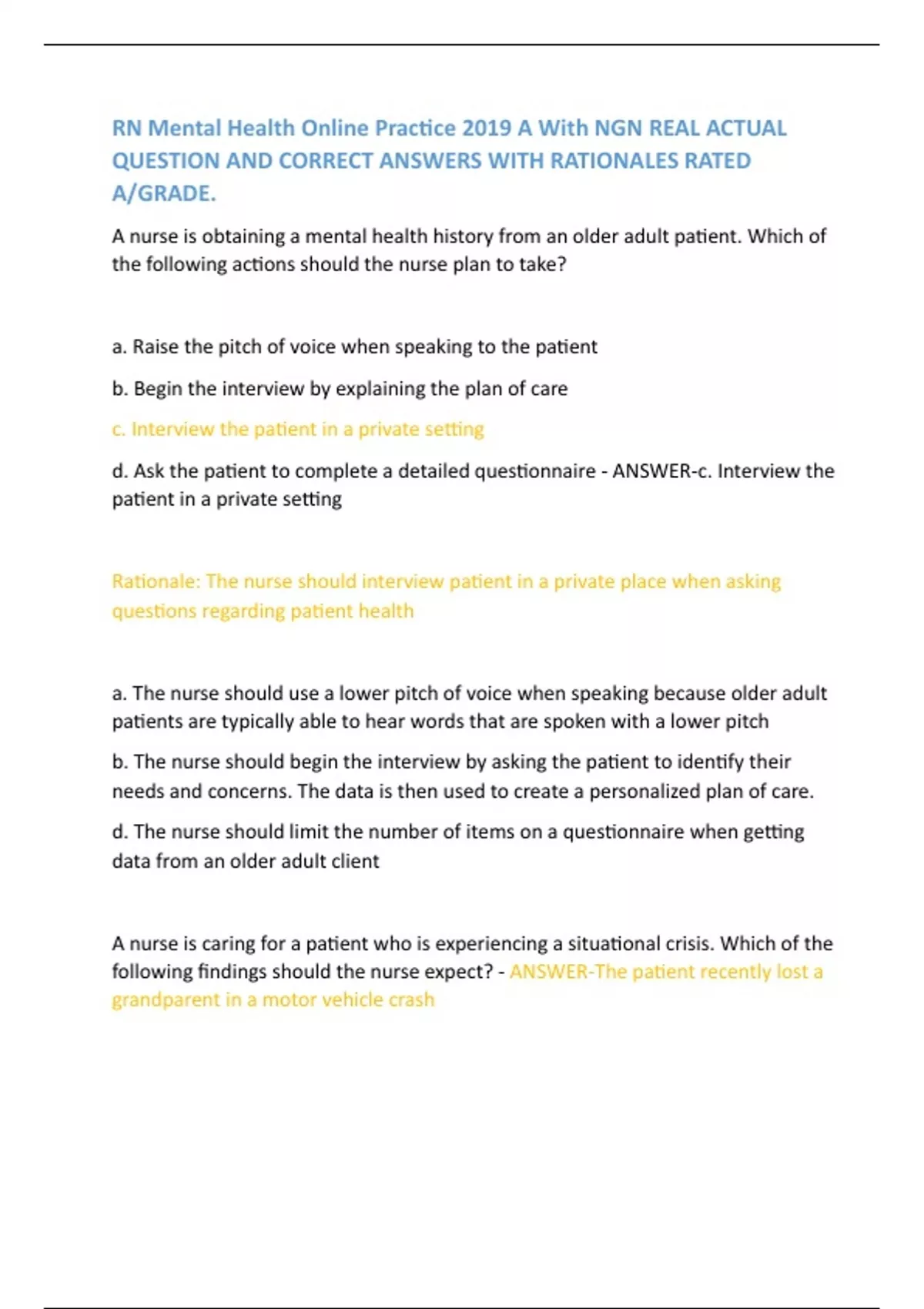 RN Mental Health Online Practice 2019 A With NGN REAL ACTUAL QUESTION AND CORRECT ANSWERS WITH RATIONALES RATED A/GRADE.