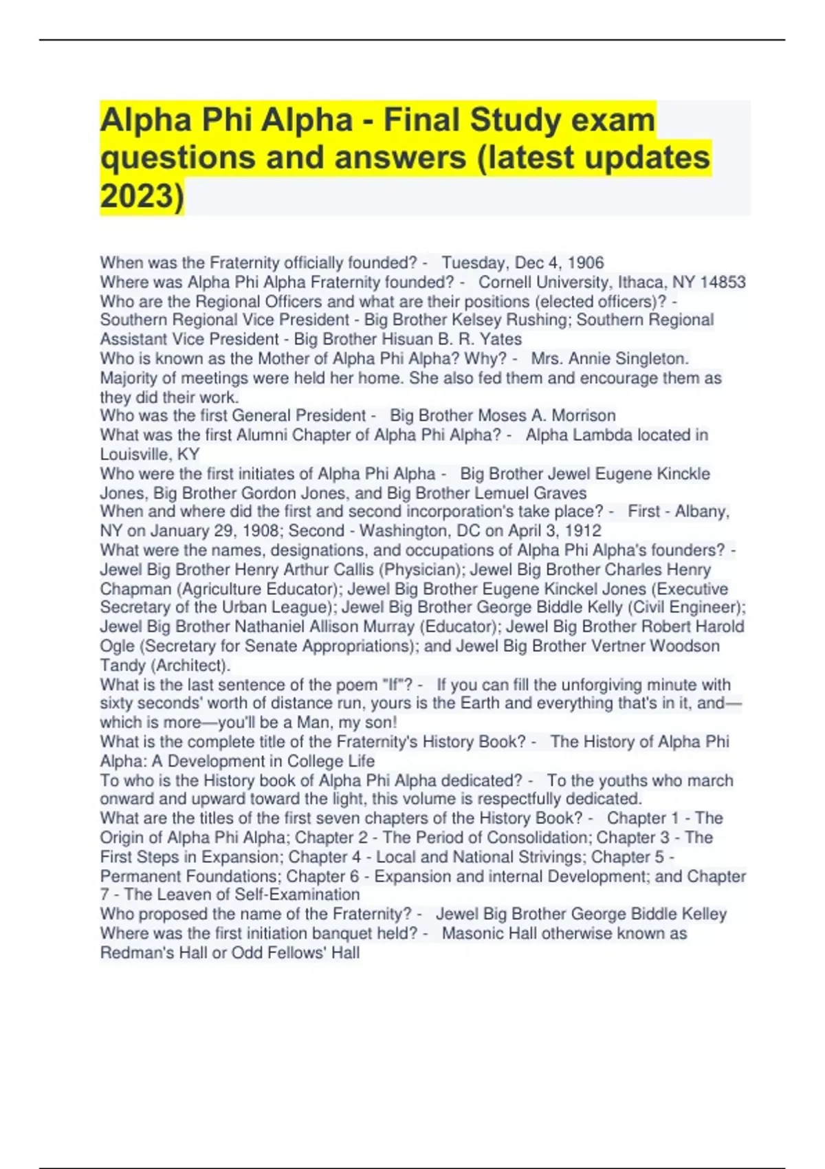 Alpha Phi Alpha - Final Study exam questions and answers (latest updates 2023) When was the Fraternity officially founded? - Tuesday, Dec 4, 1906 Where was Alpha Phi Alpha Fraternity founded? - Cornell University, Ithaca, NY 14853 Who are the Regional Officers and what are their positions (elected officers)? - Southern Regional Vice President - Big Brother Kelsey Rushing; Southern Regional Assistant Vice President - Big Brother Hisuan B. R. Yates Who is known as the Mother of Alpha Phi Alpha? Why? - Mrs. Annie Singleton. Majority of meetings were held her home. She also fed them and encourage them as they did their work. Who was the first General President - Big Brother Moses A. Morrison What was the first Alumni Chapter of Alpha Phi Alpha? - Alpha Lambda located in Louisville, KY Who were the first initiates of Alpha Phi Alpha - Big Brother Jewel Eugene Kinckle Jones, Big Brother Gordon Jones, and Big Brother Lemuel Graves When and where did the first and second incorporation's take place? - First - Albany, NY on January 29, 1908; Second - Washington, DC on April 3, 1912 What were the names, designations, and occupations of Alpha Phi Alpha's founders? - Jewel Big Brother Henry Arthur Callis (Physician); Jewel Big Brother Charles Henry Chapman (Agriculture Educator); Jewel Big Brother Eugene Kinckel Jones (Executive Secretary of the Urban League); Jewel Big Brother George Biddle Kelly (Civil Engineer); Jewel Big Brother Nathaniel Allison Murray (Educator); Jewel Big Brother Robert Harold Ogle (Secretary for Senate Appropriations); and Jewel Big Brother Vertner Woodson Tandy (Architect). What is the last sentence of the poem "If"? - If you can fill the unforgiving minute with sixty seconds' worth of distance run, yours is the Earth and everything that's in it, and— which is more—you'll be a Man, my son! What is the complete title of the Fraternity's History Book? - The History of Alpha Phi Alpha: A Development in College Life To who is the History book of Alpha Phi Alpha dedicated? - To the youths who march onward and upward toward the light, this volume is respectfully dedicated. What are the titles of the first seven chapters of the History Book? - Chapter 1 - The Origin of Alpha Phi Alpha; Chapter 2 - The Period of Consolidation; Chapter 3 - The First Steps in Expansion; Chapter 4 - Local and National Strivings; Chapter 5 - Permanent Foundations; Chapter 6 - Expansion and internal Development; and Chapter 7 - The Leaven of Self-Examination Who proposed the name of the