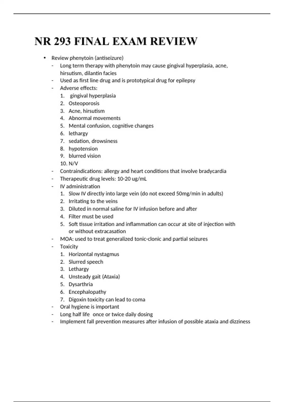 NR 293 FINAL EXAM REVIEW • Review phenytoin (antiseizure) - Long term therapy with phenytoin may cause gingival hyperplasia, acne, hirsutism, dilantin facies - Used as first line drug and is prototypical drug for epilepsy - Adverse effects: 1. gingival hyperplasia 2. Osteoporosis 3. Acne, hirsutism 4. Abnormal movements 5. Mental confusion, cognitive changes 6. lethargy 7. sedation, drowsiness 8. hypotension 9. blurred vision 10. N/V - Contraindications: allergy and heart conditions that involve bradycardia - Therapeutic drug levels: 10-20 ug/mL - IV administration 1. Slow IV directly into large vein (do not exceed 50mg/min in adults) 2. Irritating to the veins 3. Diluted in normal saline for IV infusion before and after 4. Filter must be used 5. Soft tissue irritation and inflammation can occur at site of injection with or without extracasation - MOA: used to treat generalized tonic-clonic and partial seizures - Toxicity 1. Horizontal nystagmus 2. Slurred speech 3. Lethargy 4. Unsteady gait (Ataxia) 5. Dysarthria 6. Encephalopathy 7. Digoxin toxicity can lead to coma - Oral hygiene is important - Long half life once or twice daily dosing - Implement fall prevention measures after infusion of possible ataxia and dizziness • Review theophylline (respiratory) - Xanthine derivative – plant alkaloid most commonly used - Used as a bronchodilator - MOA: increase levels of energy-producing cAMP Results: 1. Decreased cAMP levels 2. Smooth muscle relaxation 3. Bronchodilation 4. Increased airflow - Drug effects 1. Cause bronchodilation relief of bronchospasm and greater airflow 2. Cause CNS and CV stimulation 3. Inc HR inc CO and BF to kidneys (diuretic effect) - Indications 1. NOT FOR MANAGEMENT OF ACUTE asthma attacks 2. Adjunct drug for COPD management 3. Airway dilation in asthma and chronic bronchitis and emphysema - Adverse effects 1. Sinus tachycardia 2. Ventricular dysrhythmias 3. GERD during sleep 4. n/v, anorexia 5. hyperglycemia - therapeutic levels: 10-20 mcg/mL • Review H2 receptor antagonist (antihistamine) “tidine” - Used to reduce gastric acid in peptic ulcer disease and acceleration of HR - Cimetidine, ranitidine, famotidine, nizatidine • Review gentamicin (anti-infective) - Aminoglycoside (antibiotic) MOA: Prevent protein synthesis in bacteria - Often used with other drugs: beta-lactams, vancomycin - Used for virulent infections, prophylaxis in procedures involving GI and GU - NEPHROTOXICITY AND OTOTOXICITY 1. Monitor renal function – BUN and creatinine - Dosing: 5-7mg/kg per day (once) - Peak levels are drawn 30 minutes after a 30 minute infusion - Trough levels are drawn before next dose 1. Keep trough levels below 2mcg/mL - Drug concentrates in the urine can treat for UTI - Can be given IV or IM - Treat gram pos and neg bacteria - Contraindications: drug allergy, pregnant women • Review diphenhydramine (antihistamine) - H1 antagonist/H1 blocker - Traditional antihistamine that works peripherally and centrally - Anticholinergic and sedative effects - Used as hypnotic drug due to sedative effects - “hangover effect”, increased potential for falls, significant anticholinergic effects - Most commonly used - Greatest range of therapeutic indications of any antihistamine - Used for relief or prevention of histamine-mediated allergies, motion sickness, Parkinson’s disease and promotion of sleep - Diphenhydramine + epinephrine = management of anaphalaxis and acute dystonic reactions - Pregnancy category B drug - Contraindication: hypersensitivity - Caution with nursing moms, patients with lower resp tract symptoms - Antihistamine contraindications: allergy, narrow-angle glaucoma, HTN, kidney disease, COPD, bronchial asthma • Review beclomethasone (respiratory) - Inhaled corticosteroid - MOA: reducing (nonspecific) inflammation and enhancing activity of beta agonists - Primary treatment of bronchospastic disorders to control inflammatory response - Restore or increase the responsiveness of bronchial smooth muscle to beta- adrenergic receptor stimulation more pronounced stimulation of beta2 receptors by beta agonist drugs (albuterol) - May take several weeks before full therapeutic effects are realized - Persistent asthma - Contraindications: allergy, NOT BY ITSELF for acute asthma attacks, hypersensitivity, positive sputum tests for candida organisms, systemic fungal infections - Adverse effects: pharyngreal irritation, cough, dry mouth, oral fungal infection - May increase blood glucose and immunosuppression - Do not wash the inhaler or get it wet. Clean mouthpiece weekly - Rinse mouth with water
