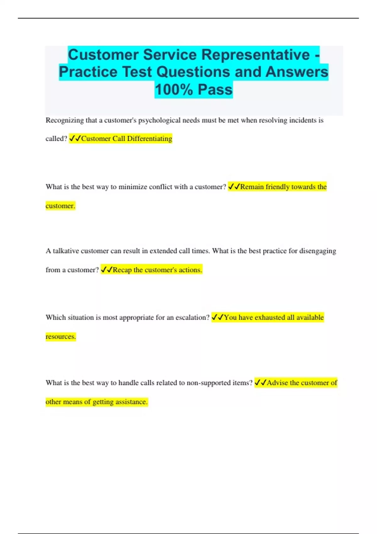Customer Service Representative - Practice Test Questions and Answers 100% Pass