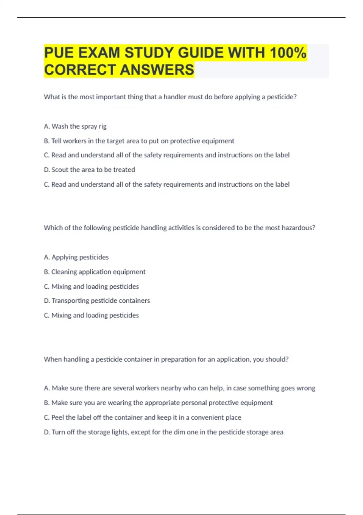 What is the most important thing that a handler must do before applying a pesticide? A. Wash the spray rig B. Tell workers in the target area to put on protective equipment C. Read and understand all of the safety requirements and instructions on the label D. Scout the area to be treated C. Read and understand all of the safety requirements and instructions on the label Which of the following pesticide handling activities is considered to be the most hazardous? A. Applying pesticides B. Cleaning application equipment C. Mixing and loading pesticides D. Transporting pesticide containers C. Mixing and loading pesticides When handling a pesticide container in preparation for an application, you should? A. Make sure there are several workers nearby who can help, in case something goes wrong B. Make sure you are wearing the appropriate personal protective equipment C. Peel the label off the container and keep it in a convenient place D. Turn off the storage lights, except for the dim one in the pesticide storage area B. Make sure you are wearing the appropriate personal protective equipment Which of the following type of container is appropriate for storage of concentrated pesticide? A. Unbreakable, plastic soft drink bottles B. Two and a half gallon cooking oil bottles C. The original container D. Clean, well-labeled buckets C. The original container Empty pesticide containers should be stored: A. In a locked area B. Together with personal protective equipment C. Anywhere convenient, after triple rinsing D. Away from pesticides, to avoid cross-contamination A. In a locked area What following factor is most likely to influence how safely a pesticide is handled? A. The toxicity of the pesticide B. The sophistication of the application equipment C. The type of application site D. The attitude and knowledge of the applicator D. The attitude and knowledge of the applicator Warning signs must be posted around which of the following storage areas? A. All pesticide storage areas B. All areas where restricted use pesticides are stored C. All areas where pesticides required to be labeled with the signal words "Warning" or "Danger" are stored D. All pesticide storage areas except those holding only exempt materials C. All areas where pesticides required to be labeled with the signal words "Warning" or "Danger" Herbicides can be safely stored with: A. Animal feed B. Other types of pesticides C. Other herbicides D. Personal protective equipment C. Other herbicides The requirement that pest control equipment drawing water from a domestic water system be equipped with an approved backflow prevention device: A. Does not apply if a closed mixing/loading system is being used B. Does not apply to a farmer spraying with his own equipment C. Applies to all persons performing pest control D. Both B and C C. Applies to all persons performing pest control Pesticides which are sprayed near streams: A. Needs to be water soluble in order to avoid water contamination B. Can cause contamination and fish kill C. Are a good source of nutrients found in fish and other aquatic life D. Needs to be water insoluble in order to avoid water contamination B. Can cause contamination and fish kill Water sources may become contaminated with pesticides as a result of: A. Drift B. Drainage from treated fields C. Improper disposal of used containers D. All of the above D. All of the above When a pesticide container is being rinsed, where should the rinse liquid be poured? A. Directly into a sewer B. Into the spray tank C. Onto the ground, away from food storage areas D. Into a nearby water course for dilution B. Into the spray tank Illegal residues on pesticides on crops, meat, and other agricultural products are often caused by: A. Use of pesticides not registered on that crop or product B. Use of excessive dosage rates C. Contaminating of soil on animal feed from nearby pesticide applications D. All of the above D. All of the above Pesticide contamination of nontarget areas is often caused by: A. Degradation B. Absorption C. Drift D. Adsorption C. Drift Unless expressly authorized by permit, certain liquid herbicides such as paraquat, with a particularly great potential for injury to nearby non-target plants, shall not be applied when wind velocity is more than: A. 5 mph B. 7 mph C. 10 mph D. 12 mph C. 10 mph Who should you contact for laws and information on the protection of endangered species from pesticides in California? A. California Department of Food and Agriculture B. U.S. Environmental Protection Agency C. U.S. Fish and Wildlife Service or the California Department of Fish and Game D. Department of Pesticide Regulation C. U.S. Fish and Wildlife Service or the California Department of Fish and Game The posting of warning signs around a treated field: A. Need only be done if the property operator thinks it is necessary B. May be continued after expiration of the restricted entry interval period if posting helps keep unwanted people out of the area C. Is always required if there is a restricted entry interval of greater than seven (7) days D. Is always required if there is a restricted entry interval of two (2) days or greater C. Is always required if there is a restricted entry interval of greater than seven (7) days A restricted entry interval is the time which must pass before people can enter a treated field: A. To engage in activities requiring substantial contact with treated crops or other treated surface B. To harvest the crops and send it to market C. To engage in pest control activities such as scouting or spraying D. To operate the irrigation system A. To engage in activities requiring substantial contact with treated crops or other treated surface When handling any pesticide, you must: A. Carry the antidote with you B. Keep up your strength by snacking while you work C. Save unrinsed containers for at least 30 days D. Bathe and change into uncontaminated clothes as soon as you finish working D. Bathe and change int
