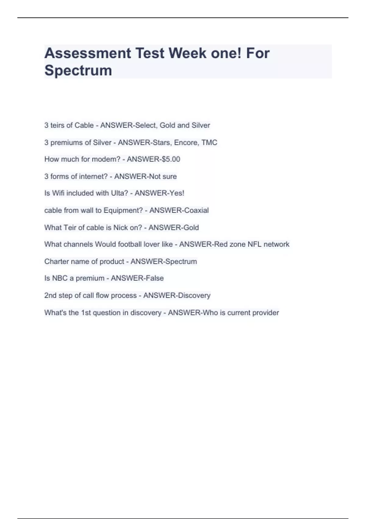 Assessm 3 teirs of Cable - ANSWER-Select, Gold and Silver 3 premiums of Silver - ANSWER-Stars, Encore, TMC How much for modem? - ANSWER-$5.00 3 forms of internet? - ANSWER-Not sure Is Wifi included with Ulta? - ANSWER-Yes! cable from wall to Equipment? - ANSWER-Coaxial What Teir of cable is Nick on? - ANSWER-Gold What channels Would football lover like - ANSWER-Red zone NFL network Charter name of product - ANSWER-Spectrum Is NBC a premium - ANSWER-False 2nd step of call flow process - ANSWER-Discovery What's ent Test Week one! For Spectrum
