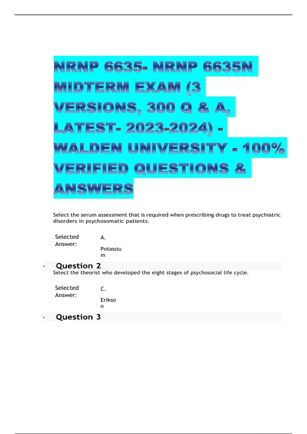 NRNP 6635- NRNP 6635N MIDTERM EXAM (3 VERSIONS, 300 Q & A, LATEST- ) - WALDEN UNIVERSITY - 100% VERIFIED QUESTIONS & ANSWERS Select the serum assessment that is required when prescribing drugs to treat psychiatric disorders in psychosomatic patients. Selected Answer: A. Potassiu m Select the theorist who developed the eight stages of psychosocial life cycle. Selected Answer: C. Erikso n Select two causes of dissociative amnesia. Selected Answers: A. Sexual abuse D. Partner betrayal Select the patient evaluation scale to be used before and during prescribing antipsychotic drugs. Selected Answer: A. MMS E Select the two comorbid disorders with which Pica occurs most commonly. Selected Answers: C. Autism D. Intellectual disability Select the prognosis range of untreated PTSD patients. Selected Answer: A. 10% recover, 20% mild symptoms, 30% moderate symptoms, 40% no change or worse Select the memory category retained in transient global amnesia that is absent in dissociative amnesia. Selected Answer: B. Sequential events The following is NOT an endocrine change noted with anorexia nervosa: Selected A. Answer: Increased Glucose Select the two most important elements of the psychiatric interview to establish a mental illness diagnosis. Selected Answers: A. Psychiatric history C. Mental status examination Select the greatest impediment to treating anorexia nervosa patients. Selected Answer: D. Noncompliance with therapy Select the sleep disorder in which cataplexy is a common symptom. Selected Answer: D. Narcolep sy Select the obsessive-compulsive disorder for which a patient is likely to initially seek help from a Primary Care Provider. Selected Answer: D. Body dysmorphia Select the rating scale used to assess obsessive-compulsive disorder. Selected Answer: C. YBOC S