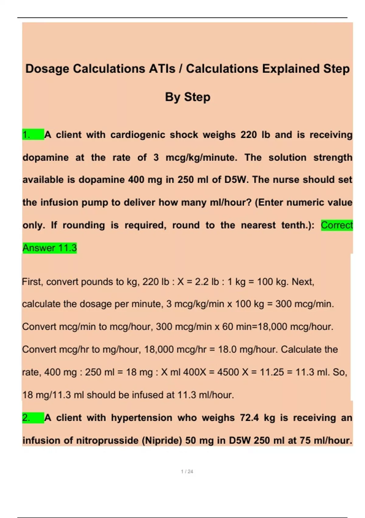 Dosage Calculations ATIs |Explained Calculations| Verified Answers A client with cardiogenic shock weighs 220 lb and is receiving dopamine at the rate of 3 mcg/kg/minute. The solution strength available is dopamine 400 mg in 250 ml of D5W. The nurse should set the infusion pump to deliver how many ml/hour? (Enter numeric value only. If rounding is required, round to the nearest tenth.): Correct Answer 11.3 First, convert pounds to kg, 220 lb : X = 2.2 lb : 1 kg = 100 kg. Next, calculate the dosage per minute, 3 mcg/kg/min x 100 kg = 300 mcg/min. Convert mcg/min to mcg/hour, 300 mcg/min x 60 min=18,000 mcg/hour. Convert mcg/hr to mg/hour, 18,000 mcg/hr = 18.0 mg/hour. Calculate the rate, 400 mg : 250 ml = 18 mg : X ml 400X = 4500 X = 11.25 = 11.3 ml. So, 18 mg/11.3 ml should be infused at 11.3 ml/hour.