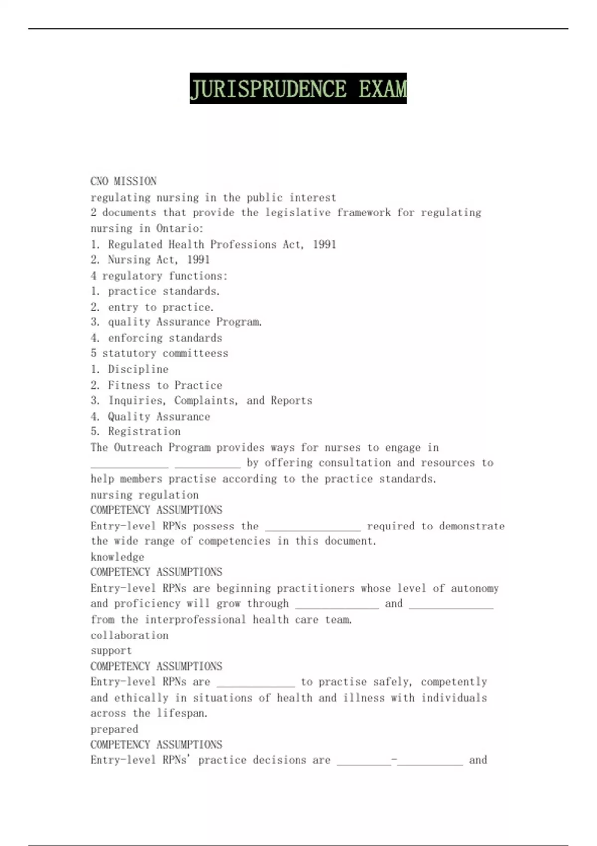 CNO MISSION regulating nursing in the public interest 2 documents that provide the legislative framework for regulating nursing in Ontario: 1. Regulated Health Professions Act, 1991 2. Nursing Act, 1991 4 regulatory functions: 1. practice standards. 2. entry to practice. 3. quality Assurance Program. 4. enforcing standards 5 statutory committeess 1. Discipline 2. Fitness to Practice 3. Inquiries, Complaints, and Reports 4. Quality Assurance 5. Registration The Outreach Program provides ways for nurses to engage in _____________ ___________ by offering consultation and resources to help members practise according to the practice standards. nursing regulation COMPETENCY ASSUMPTIONS Entry-level RPNs possess the ________________ required to demonstrate the wide range of competencies in this document. knowledge COMPETENCY ASSUMPTIONS Entry-level RPNs are beginning practitioners whose level of autonomy and proficiency will grow through ______________ and ______________ from the interprofessional health care team. collaboration support COMPETENCY ASSUMPTIONS Entry-level RPNs are _____________ to practise safely, competently and ethically in situations of health and illness with individuals across the lifespan. prepared COMPETENCY ASSUMPTIONS Entry-level RPNs' practice decisions are _________-___________ and must take into account the environment, the client's circumstances and whether the client's needs can be met by the entry-level RPN. client-specific COMPETENCY ASSUMPTIONS Entry-level RPNs enter into practice with competencies that are _______________ across diverse practice settings. transferable COMPETENCY ASSUMPTIONS Entry-level RPNs have a _______________ ___________ in nursing, health and social sciences, ethics, leadership and research. knowledge base COMPETENCY ASSUMPTIONS Entry-level RPNs are committed to engaging in quality assurance practices, including ____________ _____________. Reflective Practice COMPETENCY ASSUMPTIONS Entry-level RPNs use ____________ _______________ skills to support clinical decision-making and reflect upon practice experiences. critical thinking The entry-level RPN is accountable for: All client __________ she or he provides. care The entry-level RPN is accountable for: All decisions about _____________ _________ to other care providers assigning care The entry-level RPN is accountable for: Knowing and recognizing her or his _______________ __________ (knowledge, skill and judgment) when making decisions and providing care to clients. competence level The entry-level RPN is accountable for: Actively identifying and asking ________________ of self, colleagues (including members of the Interprofessional health care team) and clients. questions The entry-level RPN is accountable for: The application of _____________ to ______________ via the use of critical thinking and problem-solving skills consistent with the RPN's educational preparation. theory to practice WHICH COMPETENCY STATEMENT? Demonstrates professional conduct; practises in accordance with legislation and the standards as determined by the regulatory body and the practice setting; and demonstrates that the primary duty is to the client to ensure consistently safe, competent and ethical care Professional Responsibility and Accountability WHICH COMPETENCY STATEMENT? Demonstrates competence in professional judgments and practice decisions by applying principles implied in the ethical framework, and by using knowledge from many sources. Engages in critical thinking to inform clinical decision- making, which includes both systematic and analytical processes, along with reflective and critical processes. Establishes therapeutic caring and culturally safe relationships with clients and health care team members based on appropriate relational boundaries and respect Ethical Practice WHICH COMPETENCY STATEMENT? Demonstrates an understanding of the concept of public protection and the duty to practise nursing in collaboration with clients and other members of the health care team to provide and improve health care services in the best interests of the public. Service to the Public WHICH COMPETENCY STATEMENT? Demonstrates an understanding of professional self-regulation by developing and enhancing one's competence, ensuring consistently safe practice, and ensuring and maintaining one's fitness to practise. Self-Regulation DEFINITION The obligation to answer for the professional, ethical and legal responsibilities of one's activities and duties. ACCOUNTABILITY DEFINITION Actively supporting a right and good cause; supporting others for speaking for themselves or speaking on behalf of those who cannot speak for themselves. ADVOCATE DEFINITION defining lines that separate the therapeutic behaviour of an RPN from any behaviour that, well-intentioned or not, could reduce the benefit of nursing care to clients, families or communities. BOUNDARY DEFINITION Individuals, families, groups or entire communities across the lifespan who require nursing expertise. CLIENT DEFINITION To work together with one or more members of the health care team who each make a unique contribution to achieving a common goal. Each individual contributes from within the limits of her or his scope of practice. COLLABORATE DEFINITION An organized group of people bound together by ties of social, ethnic, cultural or occupational origin; or by geographic location. COMMUNITY DEFINITION The ability of a nurse to integrate the professional attributes required to perform in a given role, situation or practice setting. Professional attributes include, but are not limited to, knowledge, skill, judgment, values and beliefs. COMPETENCE DEFINITION Descriptions of the expected performance behaviour that reflects the professional attributes required in a given nursing role, situation or practice setting. COMPETENCY STATEMENTS DEFINITION Activities that are considered potentially harmful if performed by unqualified people. CONTROLLED ACTS DEFINITION Reasoni