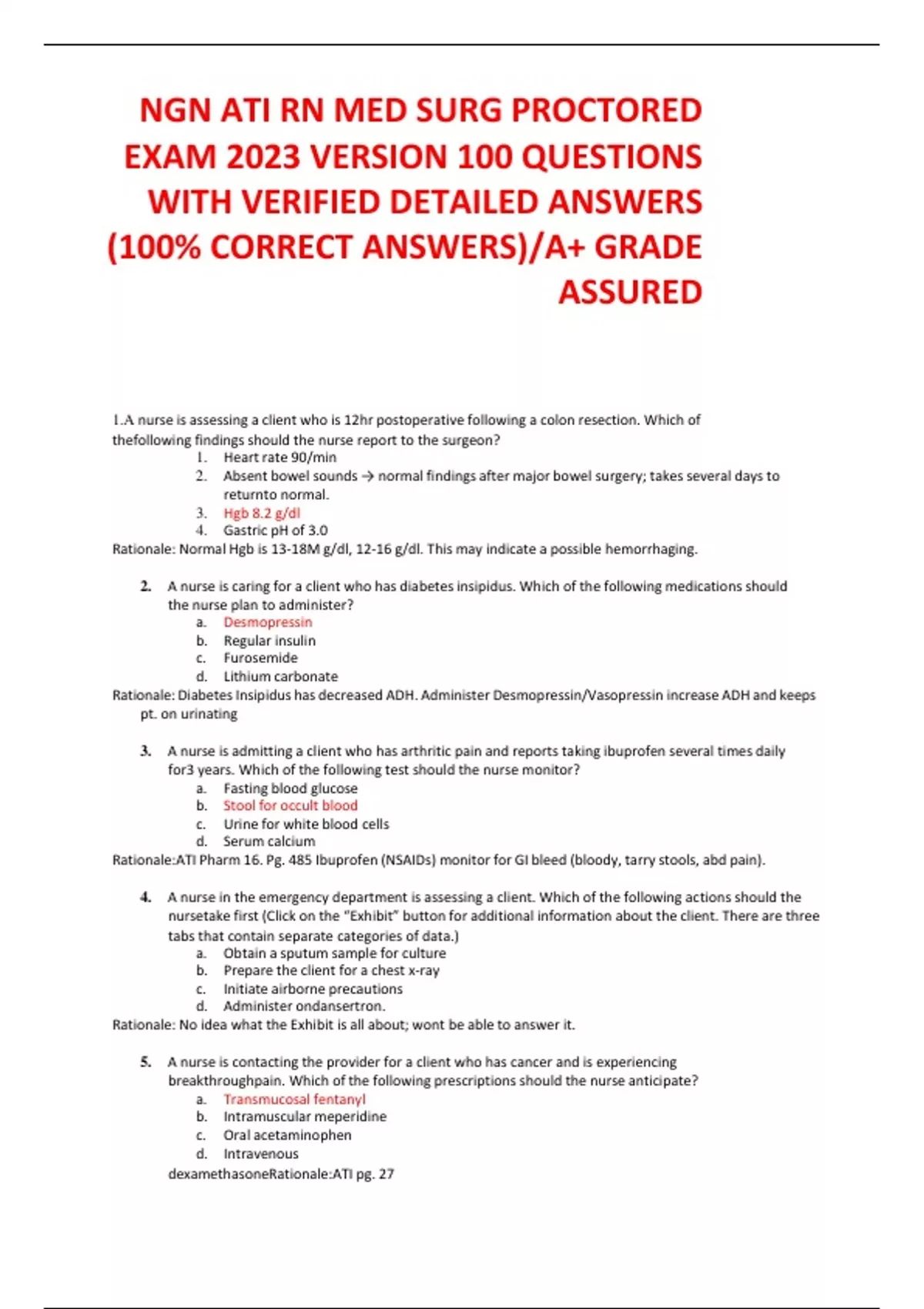 NGN ATI RN MED SURG PROCTORED EXAM 2023 VERSION 100 QUESTIONS WITH VERIFIED DETAILED ANSWERS (100% CORRECT ANSWERS)/A+ GRADE ASSURED