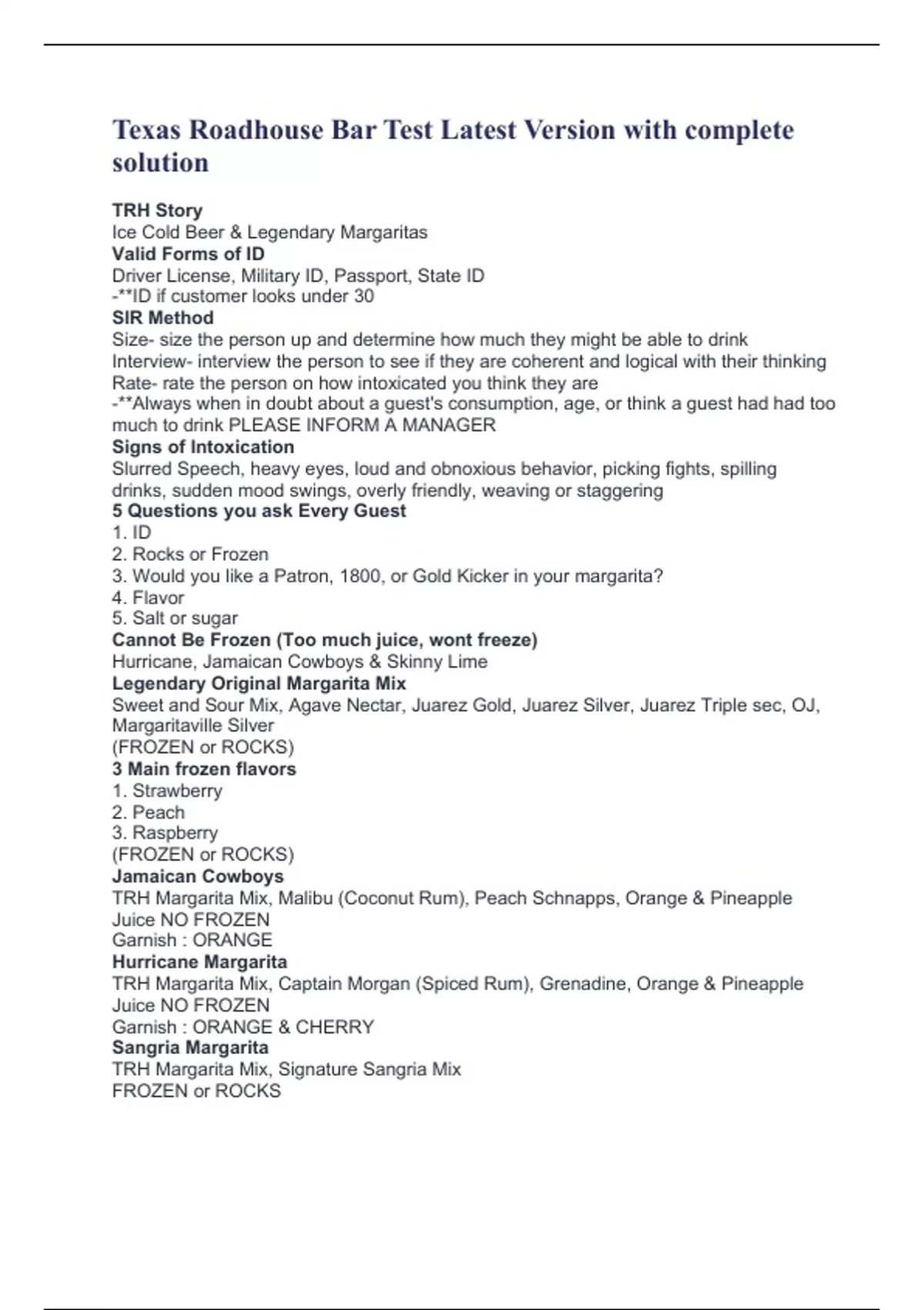 Texas Roadhouse Bar Test Latest Version with complete solution TRH Story Ice Cold Beer & Legendary Margaritas Valid Forms of ID Driver License, Military ID, Passport, State ID -**ID if customer looks under 30 SIR Method Size- size the person up and determine how much they might be able to drink Interview- interview the person to see if they are coherent and logical with their thinking Rate- rate the person on how intoxicated you think they are -**Always when in doubt about a guest's consumption, age, or think a guest had had too much to drink PLEASE INFORM A MANAGER Signs of Intoxication Slurred Speech, heavy eyes, loud and obnoxious behavior, picking fights, spilling drinks, sudden mood swings, overly friendly, weaving or staggering 5 Questions you ask Every Guest 1. ID 2. Rocks or Frozen 3. Would you like a Patron, 1800, or Gold Kicker in your margarita? 4. Flavor 5. Salt or sugar Cannot Be Frozen (Too much juice, wont freeze) Hurricane, Jamaican Cowboys & Skinny Lime Legendary Original Margarita Mix Sweet and Sour Mix, Agave Nectar, Juarez Gold, Juarez Silver, Juarez Triple sec, OJ, Margaritaville Silver (FROZEN or ROCKS) 3 Main frozen flavors 1. Strawberry 2. Peach 3. Raspberry (FROZEN or ROCKS) Jamaican Cowboys TRH Margarita Mix, Malibu (Coconut Rum), Peach Schnapps, Orange & Pineapple Juice NO FROZEN Garnish : ORANGE Hurricane Margarita TRH Margarita Mix, Captain Morgan (Spiced Rum), Grenadine, Orange & Pineapple Juice NO FROZEN Garnish : ORANGE & CHERRY Sangria Margarita TRH Margarita Mix, Signature Sangria Mix FROZEN or ROCKS