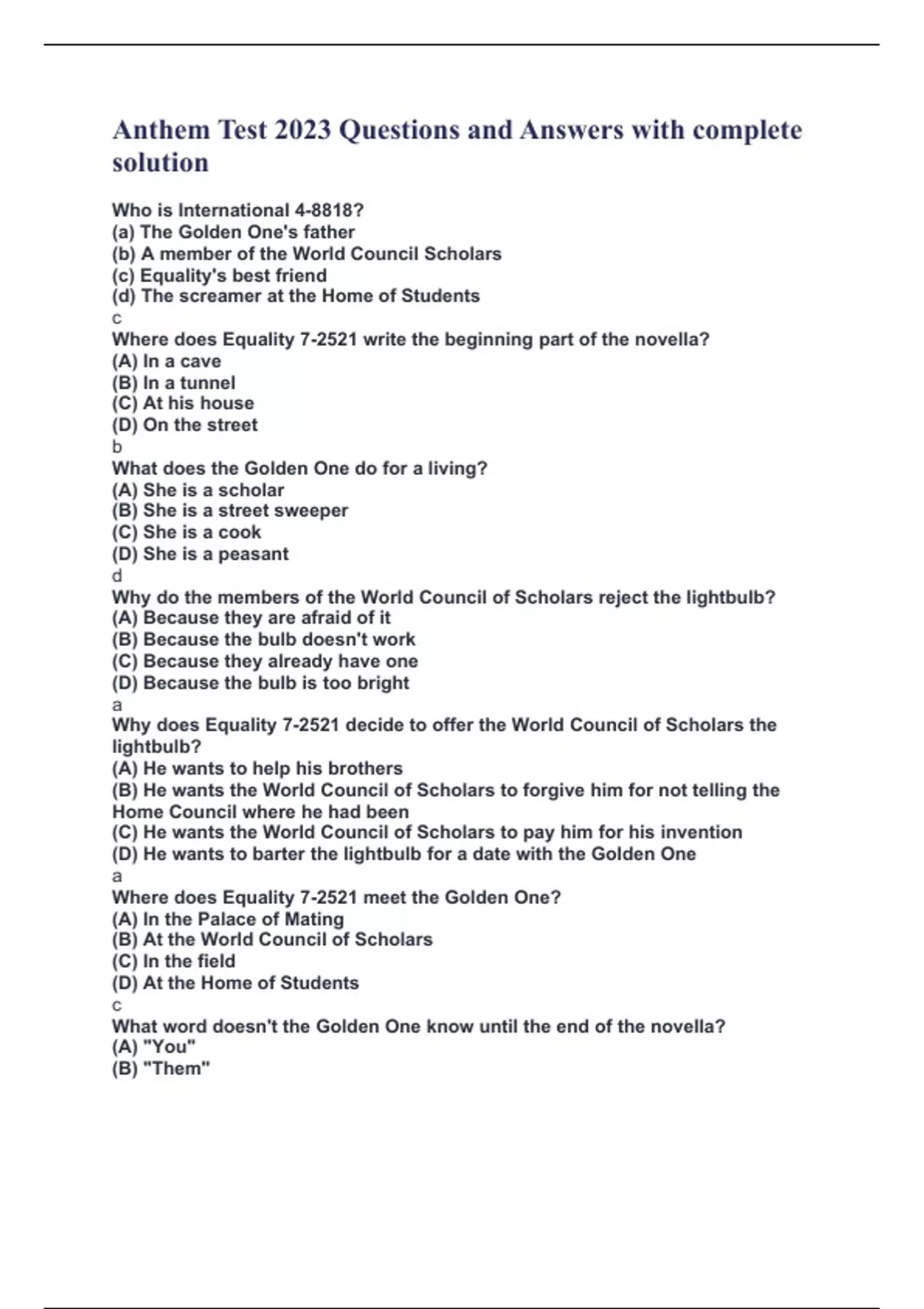 Anthem Test 2023 Questions and Answers with complete solution Who is International 4-8818? (a) The Golden One's father (b) A member of the World Council Scholars (c) Equality's best friend (d) The screamer at the Home of Students c Where does Equality 7-2521 write the beginning part of the novella? (A) In a cave (B) In a tunnel (C) At his house (D) On the street b What does the Golden One do for a living? (A) She is a scholar (B) She is a street sweeper (C) She is a cook (D) She is a peasant d Why do the members of the World Council of Scholars reject the lightbulb? (A) Because they are afraid of it (B) Because the bulb doesn't work (C) Because they already have one (D) Because the bulb is too bright a Why does Equality 7-2521 decide to offer the World Council of Scholars the lightbulb? (A) He wants to help his brothers (B) He wants the World Council of Scholars to forgive him for not telling the Home Council where he had been (C) He wants the World Council of Scholars to pay him for his invention (D) He wants to barter the lightbulb for a date with the Golden One a Where does Equality 7-2521 meet the Golden One? (A) In the Palace of Mating (B) At the World Council of Scholars (C) In the field (D) At the Home of Students c What word doesn't the Golden One know until the end of the novella? (A) "You" (B) "Them"