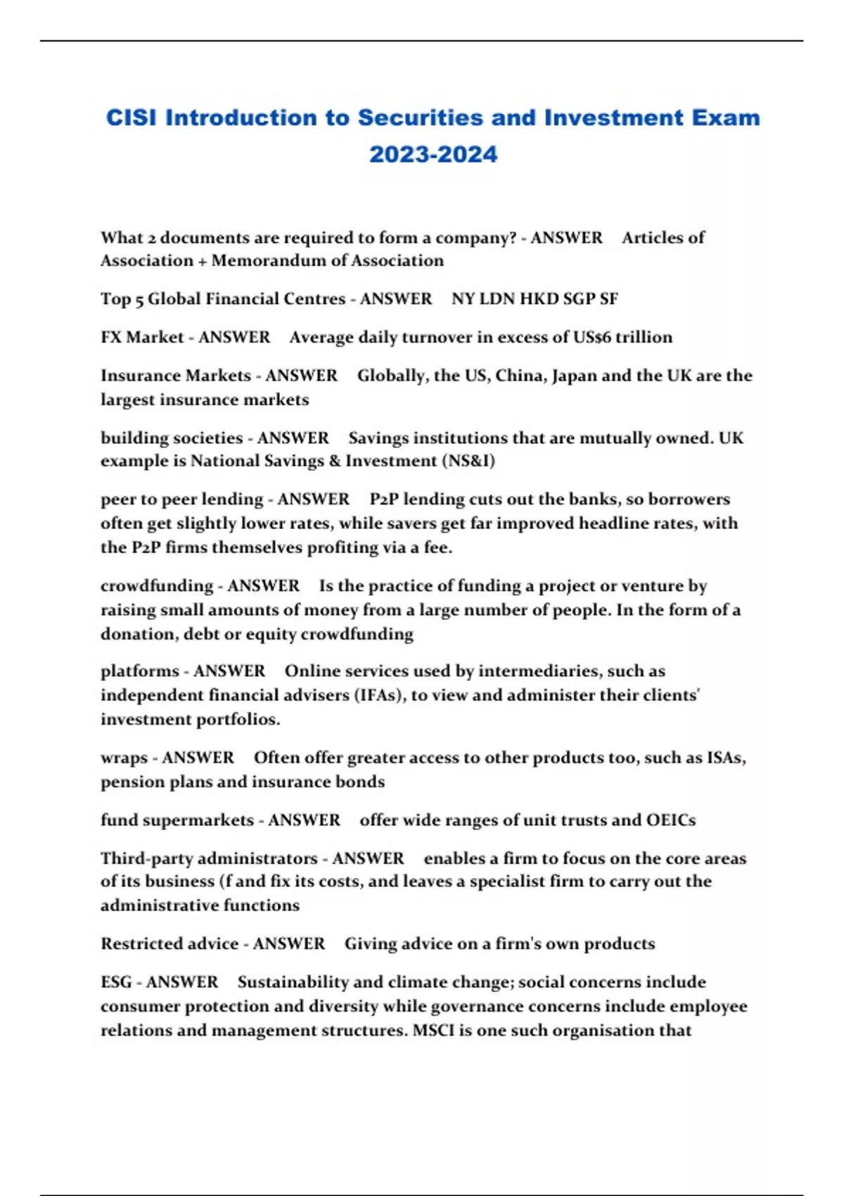 CISI Introduction to Securities and Investment Exam 2023 -2024 What 2 documents are required to form a company? - ANSWER Articles of Association + Memorandum of Association Top 5 Global Financial Centres - ANSWER NY LDN HKD SGP SF FX Market - ANSWER Average daily turnover in excess of US$6 trillion Insurance Markets - ANSWER Globally, the US, China, Japan and the UK are the largest insurance markets building societies - ANSWER Savings institutions that are mutually owned. UK example is National Savings & Investment (NS&I) peer to peer lending - ANSWER P2P lending cuts out the banks, so borrowers often get slightly lower rates, while savers get far improved headline rates, with the P2P firms themselves profiting via a fee. crowdfunding - ANSWER Is the practice of funding a project or venture by raising small amounts of money from a large number of people. In the form of a donation, debt or equity crowdfunding platforms - ANSWER Online services used by intermediaries, such as independent financial advisers (IFAs), to view and administer their clients' investment portfolios. wraps - ANSWER Often offer greater access to other products too, such as ISAs, pension plans and insurance bonds fund supermarkets - ANSWER offer wide ranges of unit trusts and OEICs Third-party administrators - ANSWER enables a firm to focus on the core areas of its business (f and fix its costs, and leaves a specialist firm to carry out the administrative functions Restricted advice - ANSWER Giving advice on a firm's own products ESG - ANSWER Sustainability and climate change; social concerns include consumer protection and diversity while governance concerns include employee relations and management structures. MSCI is one such organisation that determines the ESG rating Stages of economic cycle - ANSWER Peak, contraction, trough, expansion Public sector borrowing requirement - ANSWER The amount the government will need to borrow if public expenditure exceeds total revenue higher interest rates - ANSWER Consumers would be encouraged to save with higher interest rates. • Mortgage payments would rise, leaving less disposable income for homeowners. • The higher cost of credit would deter borrowing and hence spending. • The level of corporate investments woul d decline due to higher borrowing costs. • The corporate sector may lose confidence in the economy and become pessimistic about future prospects. central banks - ANSWER Acting as banker to the banking system by accepting deposits from, and lending to, com mercial banks. • Acting as banker to the government. • Managing the national debt. • Regulating the domestic banking system. • Acting as lender of last resort in financial crises to prevent the systemic collapse of the banking system. • Setting the officia l short- term rate of interest. • Controlling the money supply. Monetary Policy Committee - ANSWER The body within the Bank of England responsible for the conduct of monetary policy- 9 members. MPC's primary focus is to ensure that inflation is kept within a Government-set range monthly meetings QE - ANSWER QE involves the central bank creating money, which it then used to buy assets such as government bonds and high-quality debt from private companies, resulting in more money in the wider economy Financial Policy Committee (FPC) - ANSWER A part of the Bank of England that monitors and responds to risk posed to the entire financial services market. Its focus on the whole market makes it a macro-prudential authority. Prudential Regulation Authority - ANSWER the part of the Bank of England responsible for the microprudential regulation and supervision of banks, building societies, credit unions, insurers and major investment firms Financial Conduct Authority (FCA) - ANSWER The organisation that regulates financial firms providing services to consumers, and maintains the integrity of the UK's financial markets. Federal Reserve - ANSWER The central bank of the United States- comprises 12 regional Federal Reserve Banks European Central Bank (ECB) - ANSWER Located in Frankfurt, the ECB is principally responsible for setting monetary policy for the entire Eurozone, with the objective of maintaining internal price stability Inflation - ANSWER • Businesses have to continually update prices to keep pace with infla tion. • Employees find the real value of their salaries eroded. • Those on fixed levels of income, such as pensioners, will suffer as the price increases are not matched by increases in income. • Exports may become less competitive. Rising house prices can contribute to a 'feel-good' factor (although this might contribute to further inflation as house- owners become more eager to borrow and spend). • Borrowers benefit, because the value of borrowers' debt falls in real terms - ie, after adjusting for the eff ect of inflation. • Inflation also erodes the real value of a country's national debt and can benefit an economy in difficult times. deflation - ANSWER unemployment --> recession --> depression CPI - ANSWER ONS calculates inflation is to collect price data on a typical 'shopping basket' of some 700 items from month to month. To calculate changes in price, the ONS sets a base year for the total cost of the 'shopping basket' which is then converted into an index of 100; for CPI and CPIH the base year is 2015. Long-run economic growth - ANSWER the process by which rising productivity increases the average standard of living. In a mature economy, the labour force typically grows at about 1% pa, Balance of payments - ANSWER the difference between the flow of money into and out of a country Visible trade balance - ANSWER A record of the export and import of physical goods. Invisible trade balance - ANSWER A record of the trade in services, such as transportation and financial services. Current account - ANSWER The current account is used to calculate the total value of goods and services that flow into and out of a country. The curre
