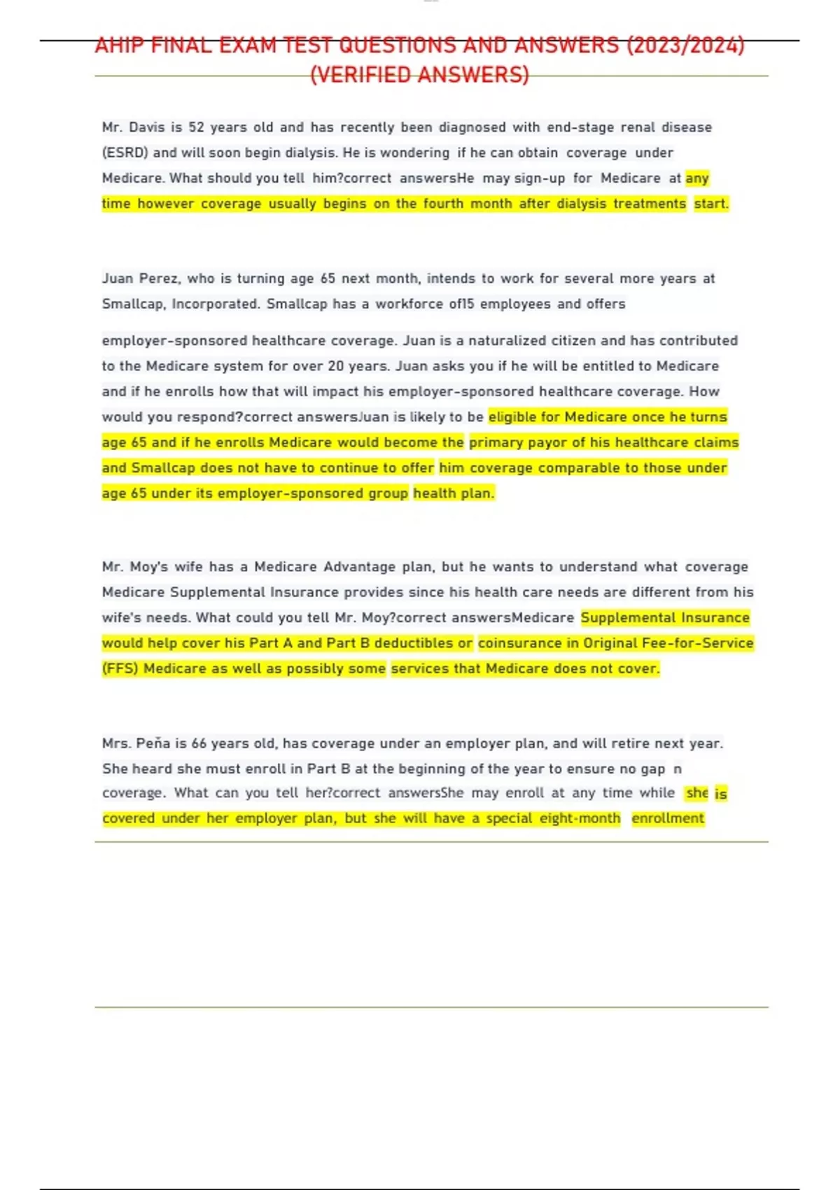 AHIP FINAL EXAM TEST QUESTIONS AND ANSWERS (2023/2024) (VERIFIED ANSWERS) Mr. Davis is 52 years old and has recently been diagnosed with end-stage renal disease (ESRD) and will soon begin dialysis. He is wondering if he can obtain coverage under Medicare. What should you tell him?correct answersHe may sign-up for Medicare at any time however coverage usually begins on the fourth month after dialysis treatments start. Juan Perez, who is turning age 65 next month, intends to work for several more years at Smallcap, Incorporated. Smallcap has a workforce of15 employees and offers employer-sponsored healthcare coverage. Juan is a naturalized citizen and has contributed to the Medicare system for over 20 years. Juan asks you if he will be entitled to Medicare and if he enrolls how that will impact his employer-sponsored healthcare coverage. How would you respond?correct answersJuan is likely to be eligible for Medicare once he turns age 65 and if he enrolls Medicare would become the primary payor of his healthcare claims and Smallcap does not have to continue to offer him coverage comparable to those under age 65 under its employer-sponsored group health plan. Mr. Moy's wife has a Medicare Advantage plan, but he wants to understand what coverage Medicare Supplemental Insurance provides since his health care needs are different from his wife's needs. What could you tell Mr. Moy?correct answersMedicare Supplemental Insurance would help cover his Part A and Part B deductibles or coinsurance in Original Fee-for-Service (FFS) Medicare as well as possibly some services that Medicare does not cover. Mrs. Peňa is 66 years old, has coverage under an employer plan, and will retire next year. She heard she must enroll in Part B at the beginning of the year to ensure no gap n coverage. What can you tell her?correct answersShe may enroll at any time while she is covered under her employer plan, but she will have a special eight-m Mr. Davis is 52 years old and has recently been diagnosed with end-stage renal disease (ESRD) and will soon begin dialysis. He is wondering if he can obtain coverage under Medicare. What should you tell him?correct answersHe may sign-up for Medicare at any time however coverage usually begins on the fourth month after dialysis treatments start. Juan Perez, who is turning age 65 next month, intends to work for several more years at Smallcap, Incorporated. Smallcap has a workforce of15 employees and offers employer-sponsored healthcare coverage. Juan is a naturalized citizen and has contributed to the Medicare system for over 20 years. Juan asks you if he will be entitled to Medicare and if he enrolls how that will impact his employer-sponsored healthcare coverage. How would you respond?correct answersJuan is likely to be eligible for Medicare once he turns age 65 and if he enrolls Medicare would become the primary payor of his healthcare claims and Smallcap does not have to continue to offer him coverage comparable to those under age 65 under its employer-sponsored group health plan. Mr. Moy's wife has a Medicare Advantage plan, but he wants to understand what coverage Medicare Supplemental Insurance provides since his health care needs are different from his wife's needs. What could you tell Mr. Moy?correct answersMedicare Supplemental Insurance would help cover his Part A and Part B deductibles or coinsurance in Original Fee-for-Service (FFS) Medicare as well as possibly some services that Medicare does not cover. Mrs. Peňa is 66 years old, has coverage under an employer plan, and will retire next year. She heard she must enroll in Part B at the beginning of the year to ensure no gap n coverage. What can you tell her?correct answersShe may enroll at any time while she is covered under her employer plan, but she will have a special eight-m