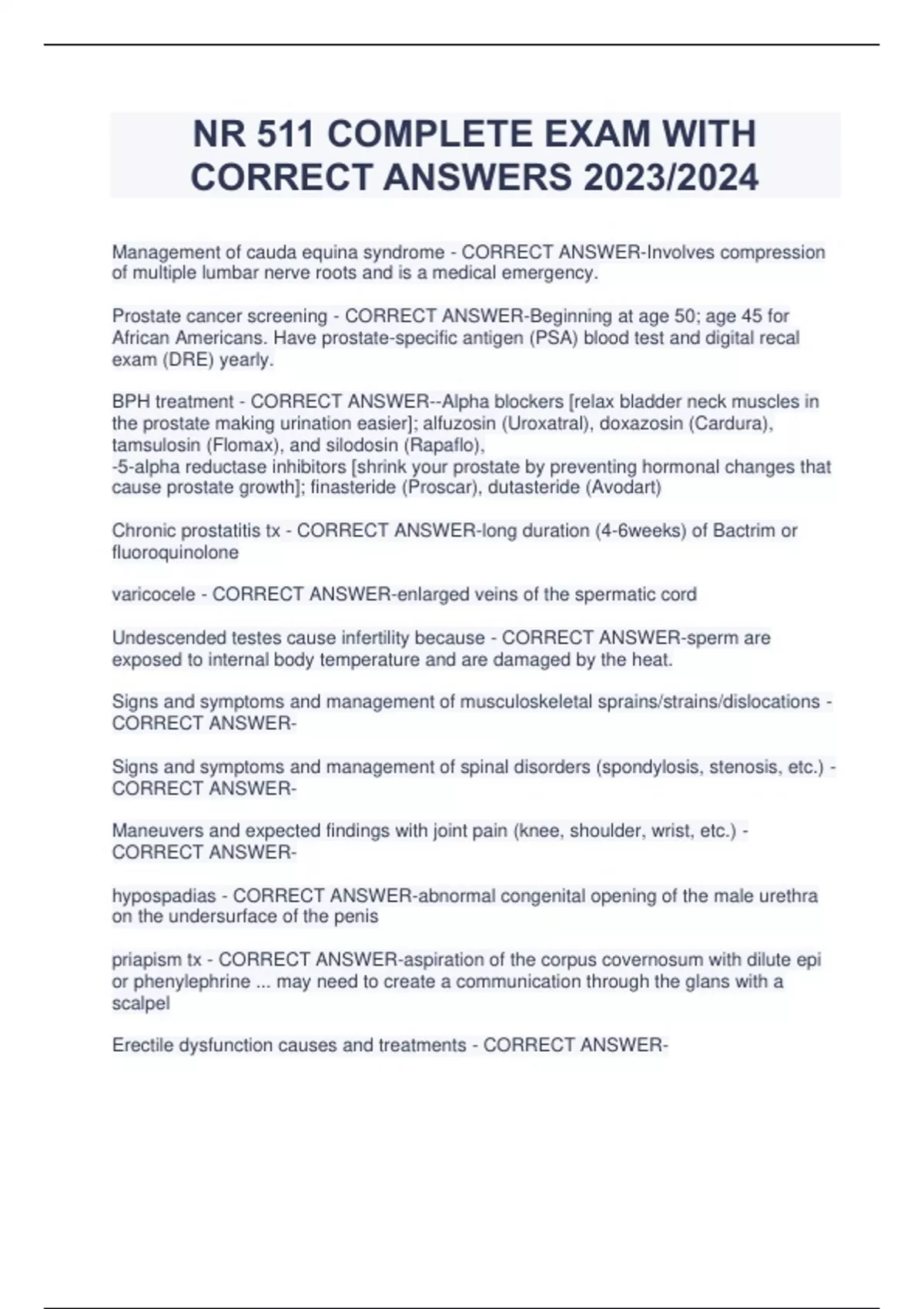 Management of cauda equina syndrome - CORRECT ANSWER-Involves compression of multiple lumbar nerve roots and is a medical emergency. Prostate cancer screening - CORRECT ANSWER-Beginning at age 50; age 45 for African Americans. Have prostate-specific antigen (PSA) blood test and digital recal exam (DRE) yearly. BPH treatment - CORRECT ANSWER--Alpha blockers [relax bladder neck muscles in the prostate making urination easier]; alfuzosin (Uroxatral), doxazosin (Cardura), tamsulosin (Flomax), and silodosin (Rapaflo), -5-alpha reductase inhibitors [shrink your prostate by preventing hormonal changes that cause prostate growth]; finasteride (Proscar), dutasteride (Avodart) Chronic prostatitis tx - CORRECT ANSWER-long duration (4-6weeks) of Bactrim or fluoroquinolone varicocele - CORRECT ANSWER-enlarged veins of the spermatic cord Undescended testes cause infertility because - CORRECT ANSWER-sperm are exposed to internal body temperature and are damaged by the heat. Signs and symptoms and management of musculoskeletal sprains/strains/dislocations - CORRECT ANSWERSigns and symptoms and management of spinal disorders (spondylosis, stenosis, etc.) - CORRECT ANSWERManeuvers and expected findings with joint pain (knee, shoulder, wrist, etc.) - CORRECT ANSWERhypospadias - CORRECT ANSWER-abnormal congenital opening of the male u