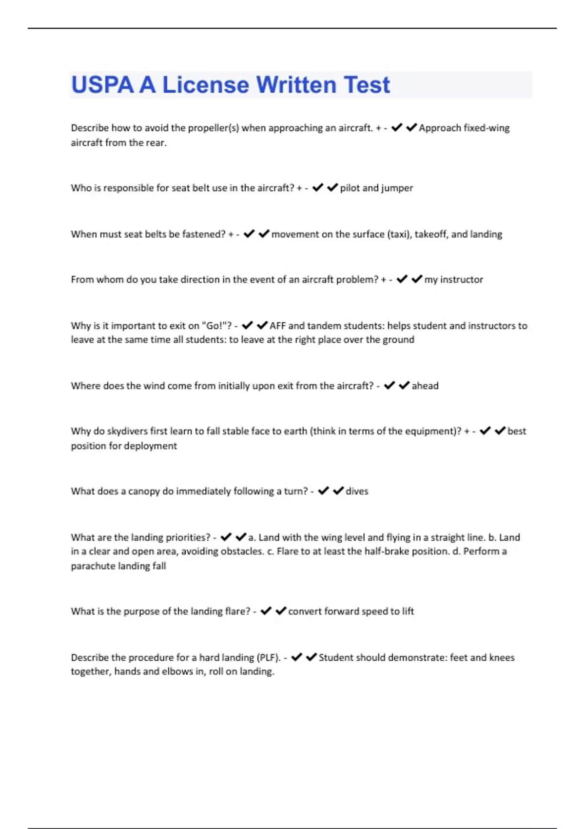 Describe how to avoid the propeller(s) when approaching an aircraft. + - Approach fixed-wing aircraft from the rear. Who is responsible for seat belt use in the aircraft? + - pilot and jumper When must seat belts be fastened? + - movement on the surface (taxi), takeoff, and landing From whom do you take direction in the event of an aircraft problem? + - my instructor Why is it important to exit on "Go!"? - AFF and tandem students: helps student and instructors to leave at the same time all students: to leave at the right place over the ground Where does the wind come from initially upon exit from the aircraft? - ahead Why do skydivers first learn to fall stable face to earth (think in terms of the equipment)? + - best position for deployment What does a canopy do immediately following a turn? - dives What are the landing priorities? - a. Land with the wing level and flying in a straight line. b. Land in a clear and open area, avoiding obstacles. c. Flare to at least the half-brake position. d. Perform a parachute landing fall What is the purpose of the landing flare? - convert forward speed to lift Describe the procedure for a hard landing (PLF). - Student should demonstrate: feet and knees together, hands and elbows in, roll on landing.Category B: Who must directly supervise your student training jumps? - USPA Instructor rated for my discipline What is your most important task when in freefall? - altitude awareness to recognize and act at the assigned pull altitude