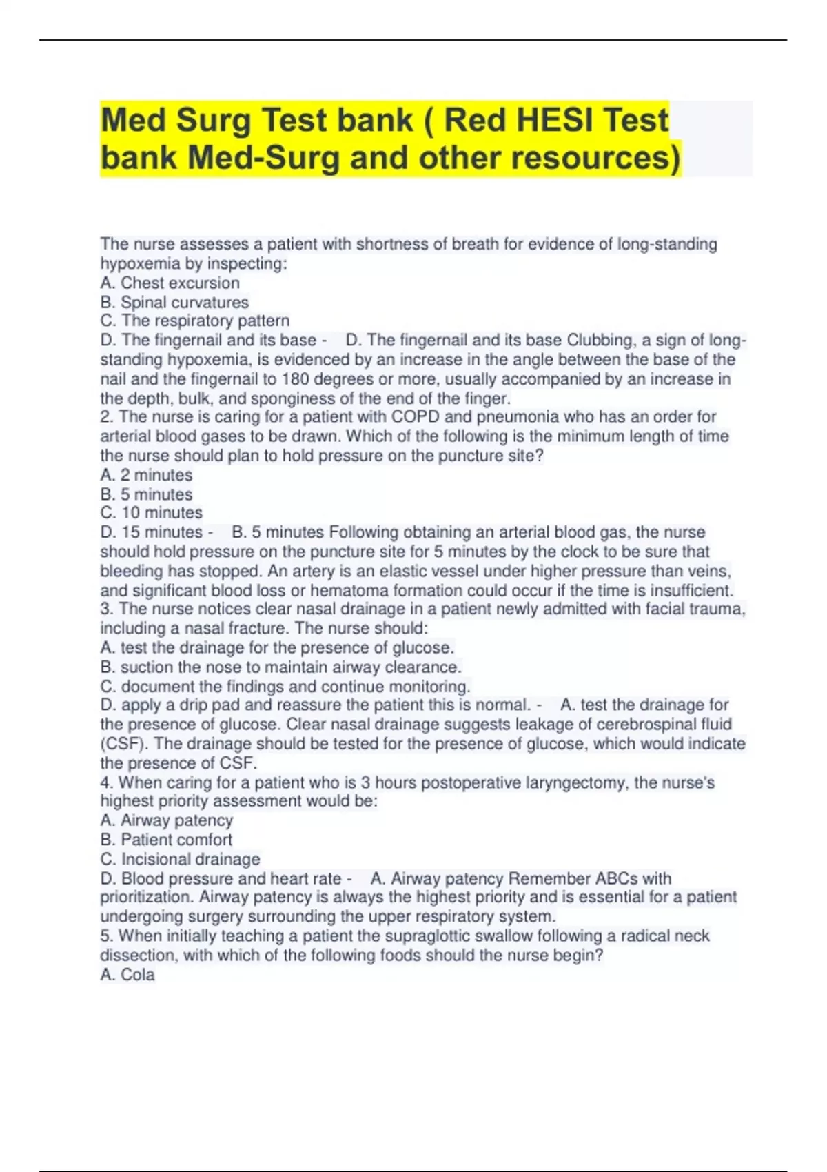 Med Surg Test bank ( Red HESI Test bank Med-Surg and other resources) The nurse assesses a patient with shortness of breath for evidence of long-standing hypoxemia by inspecting: A. Chest excursion B. Spinal curvatures C. The respiratory pattern D. The fingernail and its base - D. The fingernail and its base Clubbing, a sign of longstanding hypoxemia, is evidenced by an increase in the angle between the base of the nail and the fingernail to 180 degrees or more, usually accompanied by an increase in the depth, bulk, and sponginess of the end of the finger. 2. The nurse is caring for a patient with COPD and pneumonia who has an order for arterial blood gases to be drawn. Which of the following is the minimum length of time the nurse should plan to hold pressure on the puncture site? A. 2 minutes B. 5 minutes C. 10 minutes D. 15 minutes - B. 5 minutes Following obtaining an arterial blood gas, the nurse should hold pressure on the puncture site for 5 minutes by the clock to be sure that bleeding has stopped. An artery is an elastic vessel under higher pressure than veins, and significant blood loss or hematoma formation could occur if the time is insufficient. 3. The nurse notices clear nasal drainage in a patient newly admitted with facial trauma, including a nasal fracture. The nurse should: A. test the drainage for the presence of glucose. B. suction the nose to maintain airway clearance. C. document the findings and continue monitoring. D. apply a drip pad and reassure the patient this is normal. - A. test the drainage for the presence of glucose. Clear nasal drainage suggests leakage of cerebrospinal fluid (CSF). The drainage should be tested for the presence of glucose, which would indicate the presence of CSF. 4. When caring for a patient who is 3 hours postoperative laryngectomy, the nurse's highest priority assessment would be: A. Airway patency B. Patient comfort C. Incisional drainage D. Blood pressure and heart rate - A. Airway patency Remember ABCs with prioritization. Airway patency is always the highest priority and is essential for a patient undergoing surgery surrounding the upper respiratory system. 5. When initially teaching a patient the supraglottic swallow following a radical neck dissection, with which of the following foods should the nurse begin? A. Cola B. Applesauce C. French fries D. White grape juice - A. ColaWhen learning the supraglottic swallow, it may be helpful to start with carbonated beverages because the effervescence provides clues about the liquid's position. Thin, watery fluids should be avoided because they are difficult to swallow and increase the risk of aspiration. Nonpourable pureed foods, such as applesauce, would decrease the risk of aspiration, but carbonated beverages are the better choice to start with. 6. The nurse is caring for a patient admitted to the hospital with pneumonia. Upon assessment, the nurse notes a temperature of 101.4° F, a productive cough with yellow sputum and a respiratory rate of 20. Which of the following nursing diagnosis is most appropriate based upon this assessment? A. Hyperthermia related to infectious illness B. Ineffective thermoregulation related to chilling C. Ineffective breathing pattern related to pneumonia D. Ineffective airway clearance related to thick secretions - A. Hyperthermia related to infectious illness Because the patient has spiked a temperature and has a diagnosis of pneumonia, the logical nursing diagnosis is hyperthermia related to infectious illness. There is no evidence of a chill, and her breathing pattern is within normal limits at 20 breaths per minute. Th