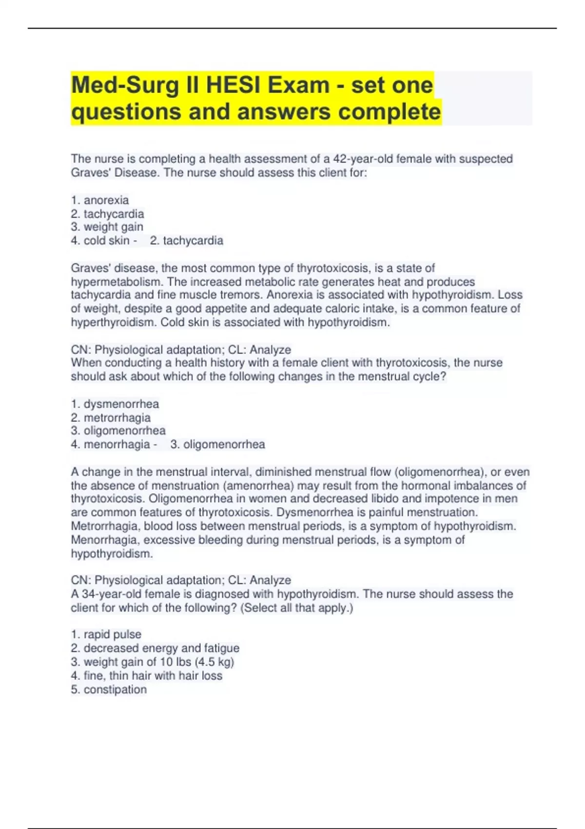 Med-Surg II HESI Exam - set one questions and answers complete The nurse is completing a health assessment of a 42-year-old female with suspected Graves' Disease. The nurse should assess this client for: 1. anorexia 2. tachycardia 3. weight gain 4. cold skin - 2. tachycardia Graves' disease, the most common type of thyrotoxicosis, is a state of hypermetabolism. The increased metabolic rate generates heat and produces tachycardia and fine muscle tremors. Anorexia is associated with hypothyroidism. Loss of weight, despite a good appetite and adequate caloric intake, is a common feature of hyperthyroidism. Cold skin is associated with hypothyroidism. CN: Physiological adaptation; CL: Analyze When conducting a health history with a female client with thyrotoxicosis, the nurse should ask about which of the following changes in the menstrual cycle? 1. dysmenorrhea 2. metrorrhagia 3. oligomenorrhea 4. menorrhagia - 3. oligomenorrhea A change in the menstrual interval, diminished menstrual flow (oligomenorrhea), or even the absence of menstruation (amenorrhea) may result from the hormonal imbalances of thyrotoxicosis. Oligomenorrhea in women and decreased libido and impotence in men are common features of thyrotoxicosis. Dysmenorrhea is painful menstruation. Metrorrhagia, blood loss between menstrual periods, is a symptom of hypothyroidism. Menorrhagia, excessive bleeding during menstrual periods, is a symptom of hypothyroidism. CN: Physiological adaptation; CL: Analyze A 34-year-old female is diagnosed with hypothyroidism. The nurse should assess the client for which of the following? (Select all that apply.) 1. rapid pulse 2. decreased energy and fatigue 3. weight gain of 10 lbs (4.5 kg) 4. fine, thin hair with hair loss 5. constipation 6. menorrhagia. - 2. decreased energy and fatigue, 3. weight gain of 10 lbs (4.5 kg), 5. constipation, 6. menorrhagia Clients with hypothyroidism exhibit symptoms indicating a lack of thyroid hormone. Bradycardia, decreased energy and lethargy, memory problems, weight gain, coarse hair, constipation, and menorrhagia are common signs and symptoms of hypothyroidism. CN: Physiological adaptation; CL: Analyze Propylthiouracil (PTU) is prescribed for a client with Graves' disease. The nurse should teach the client to immediately report which of th
