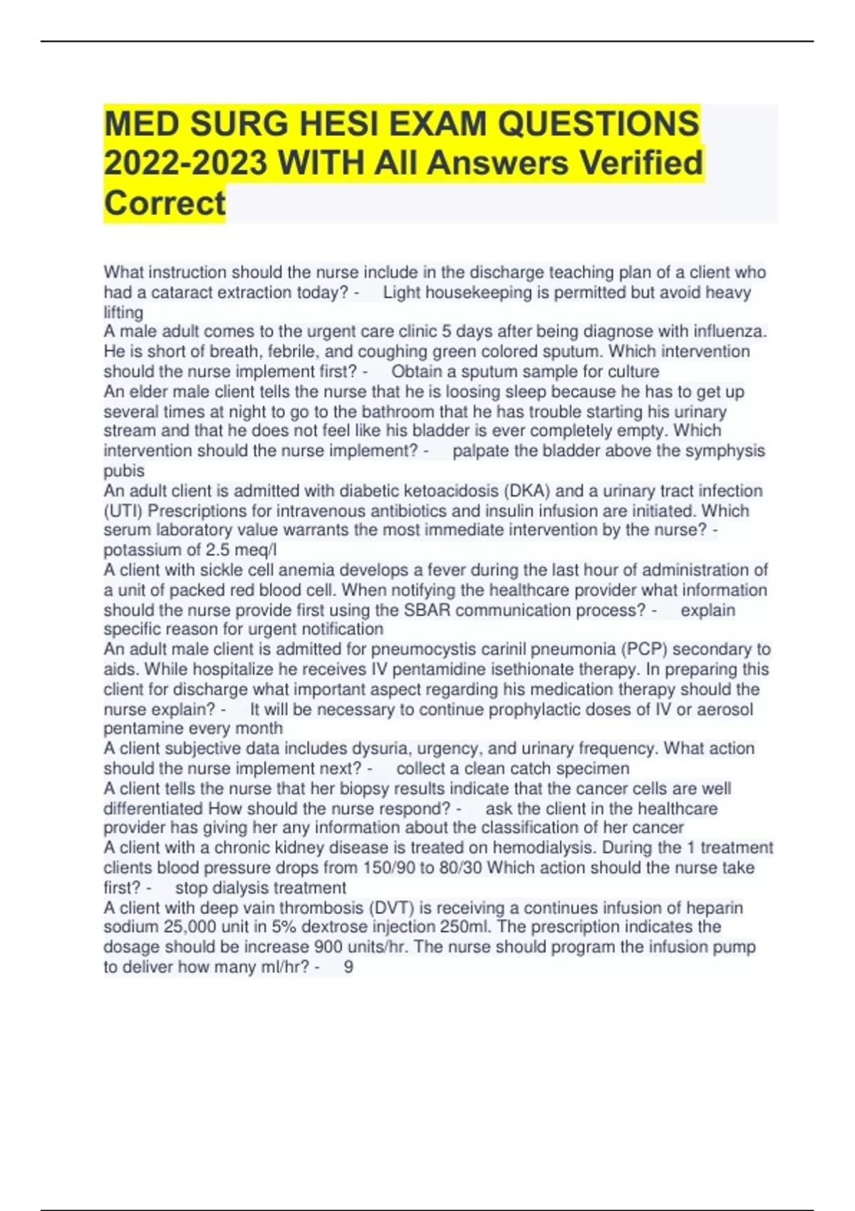 MED SURG HESI EXAM QUESTIONS WITH All Answers Verified Correct What instruction should the nurse include in the discharge teaching plan of a client who had a cataract extraction today? - Light housekeeping is permitted but avoid heavy lifting A male adult comes to the urgent care clinic 5 days after being diagnose with influenza. He is short of breath, febrile, and coughing green colored sputum. Which intervention should the nurse implement first? - Obtain a sputum sample for culture An elder male client tells the nurse that he is loosing sleep because he has to get up several times at night to go to the bathroom that he has trouble starting his urinary stream and that he does not feel like his bladder is ever completely empty. Which intervention should the nurse implement? - palpate the bladder above the symphysis pubis An adult client is admitted with diabetic ketoacidosis (DKA) and a urinary tract infection (UTI) Prescriptions for intravenous antibiotics and insulin infusion are initiated. Which serum laboratory value warrants the most immediate intervention by the nurse? - potassium of 2.5 meq/l A client with sickle cell anemia develops a fever during the last hour of administration of a unit of packed red blood cell. When notifying the healthcare provider what information should the nurse provide first using the SBAR communication process? - explain specific reason for urgent notification An adult male client is admitted for pneumocystis carinil pneumonia (PCP) secondary to aids. While hospitalize he receives IV pentamidine isethionate therapy. In preparing this client for discharge what important aspect regarding his medication therapy should the nurse explain? - It will be necessary to continue prophylactic doses of IV or aerosol pentamine every month A client subjective data includes dysuria, urgency, and urinary frequency. What action should the nurse implement next? - collect a clean catch specimen A client tells the nurse that her biopsy results indicate that the cancer cells are well differentiated How should the nurse respond? - ask the client in the healthcare provider has giving her any information about the classification of her cancer A client with a chronic kidney disease is treated on hemodialysis. During the 1 treatment clients blood pressure drops from 150/90 to 80/30 Which action should the nurse take first? - stop dialysis treatment A client with deep vain thrombosis (DVT) is receiving a continues infusion of heparin sodium 25,000 unit in 5% dextrose injection 250ml. The prescription indicates the dosage should be increase 900 units/hr. The nurse should program the infusion pump to deliver how m