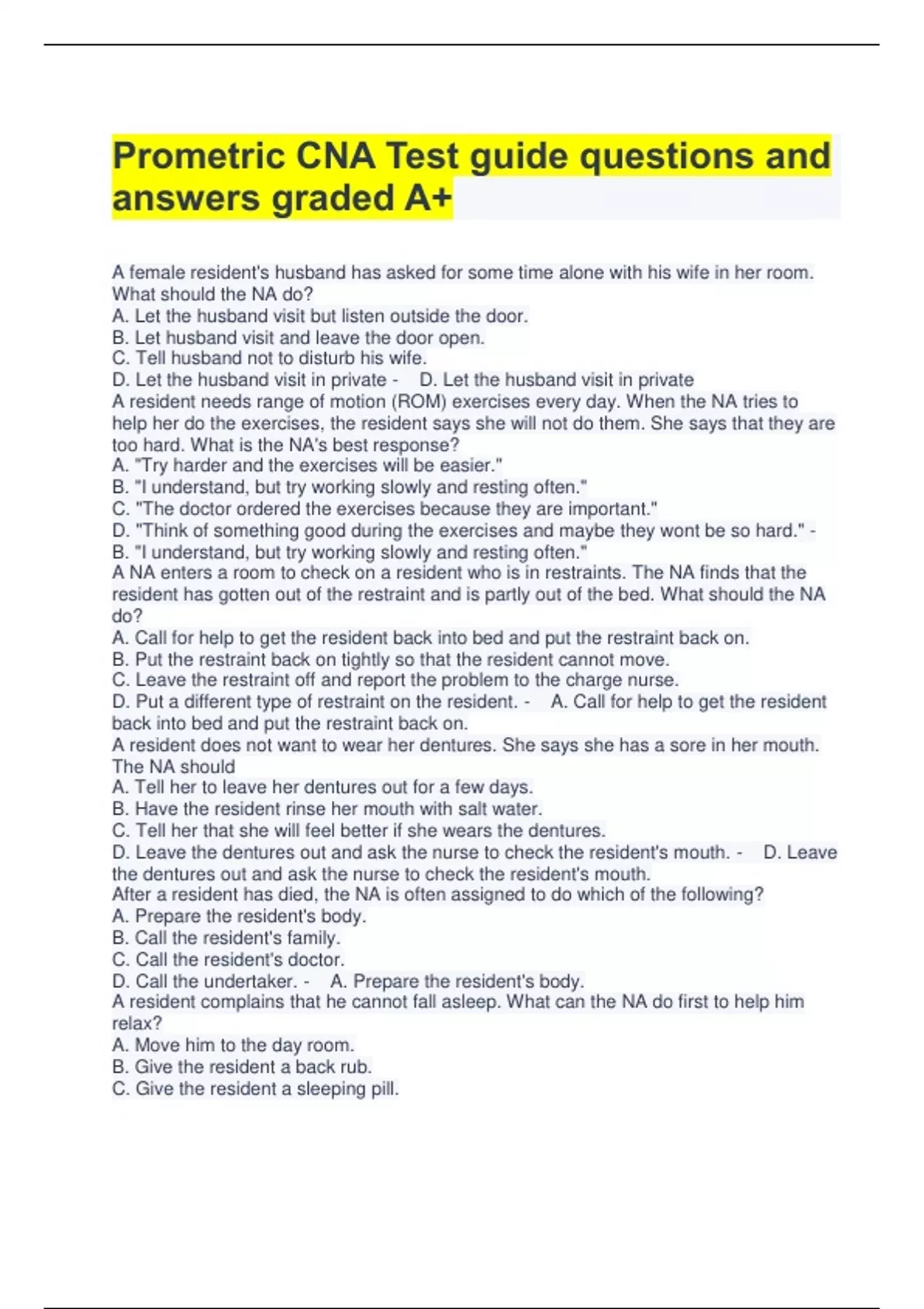Prometric CNA Test guide questions and answers graded A+ A female resident's husband has asked for some time alone with his wife in her room. What should the NA do? A. Let the husband visit but listen outside the door. B. Let husband visit and leave the door open. C. Tell husband not to disturb his wife. D. Let the husband visit in private - D. Let the husband visit in private A resident needs range of motion (ROM) exercises every day. When the NA tries to help her do the exercises, the resident says she will not do them. She says that they are too hard. What is the NA's best response? A. "Try harder and the exercises will be easier." B. "I understand, but try working slowly and resting often." C. "The doctor ordered the exercises because they are important." D. "Think of something good during the exercises and maybe they wont be so hard." - B. "I understand, but try working slowly and resting often." A NA enters a room to check on a resident who is in restraints. The NA finds that the resident has gotten out of the restraint and is partly out of the bed. What should the NA do? A. Call for help to get the resident back into bed and put the restraint back on. B. Put the restraint back on tightly so that the resident cannot move. C. Leave the restraint off and report the problem to the charge nurse. D. Put a different type of restraint on the resident. - A. Call for help to get the resident back into bed and put the restraint back on. A resident does not want to wear her dentures. She says she has a sore in her mouth. The NA should A. Tell her to leave her dentures out for a few days. B. Have the resident rinse her mouth with salt water. C. Tell her that she will feel better if she wears the dentures. D. Leave the dentures out and ask the nurse to check the resident's mouth. - D. Leave the dentures out and ask the nurse to check the resident's mouth. After a resident has died, the NA is often assigned to do which of the following? A. Prepare the resident's body. B. Call the resident's family. C. Call the resident's doctor. D. Call the undertaker. - A. Prepare the resident's body. A resident complains that he cannot fall asleep. What can the NA do first to help him relax? A. Move him to the day room. B. Give the resident a back rub. C. Give the resid
