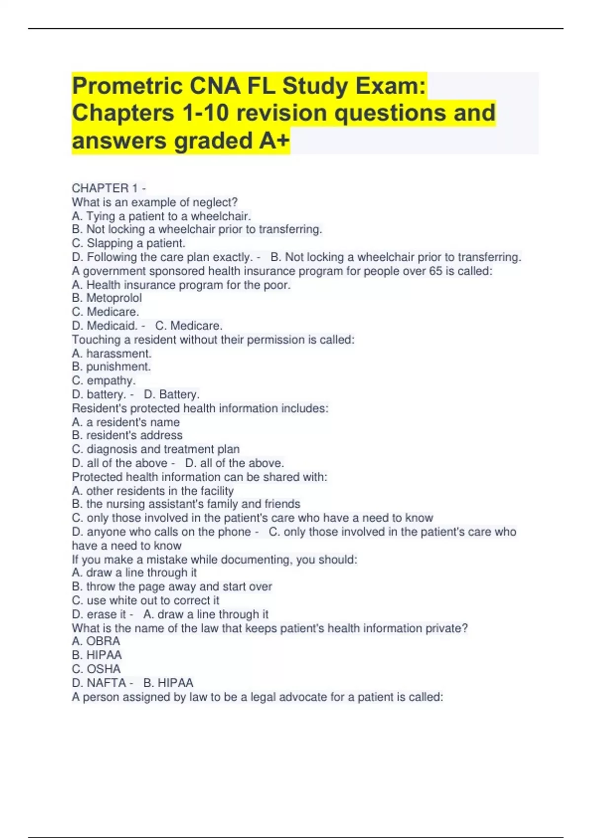 Prometric CNA FL Study Exam: Chapters 1-10 revision questions and answers graded A+ CHAPTER 1 - What is an example of neglect? A. Tying a patient to a wheelchair. B. Not locking a wheelchair prior to transferring. C. Slapping a patient. D. Following the care plan exactly. - B. Not locking a wheelchair prior to transferring. A government sponsored health insurance program for people over 65 is called: A. Health insurance program for the poor. B. Metoprolol C. Medicare. D. Medicaid. - C. Medicare. Touching a resident without their permission is called: A. harassment. B. punishment. C. empathy. D. battery. - D. Battery. Resident's protected health information includes: A. a resident's name B. resident's address C. diagnosis and treatment plan D. all of the above - D. all of th