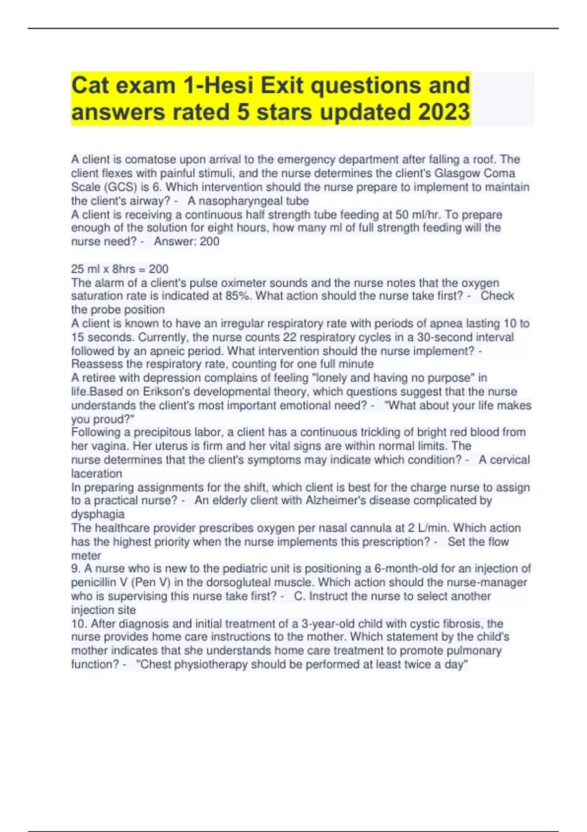 Cat exam 1-Hesi Exit questions and answers rated 5 stars updated 2023 A client is comatose upon arrival to the emergency department after falling a roof. The client flexes with painful stimuli, and the nurse determines the client's Glasgow Coma Scale (GCS) is 6. Which intervention should the nurse prepare to implement to maintain the client's airway? - A nasopharyngeal tube A client is receiving a continuous half strength tube feeding at 50 ml/hr. To prepare enough of the solution for eight hours, how many ml of full strength feeding will the nurse need? - Answer: 200 25 ml x 8hrs = 200 The alarm of a client's pulse oximeter sounds and the nurse notes that the oxygen saturation rate is indicated at 85%. What action should the nurse take first? - Check the probe position A client is known to have an irregular respiratory rate with periods of apnea lasting 10 to 15 seconds. Currently, the nurse counts 22 respiratory cycles in a 30-second interval followed by an apneic period. What intervention should the nurse implement? - Reassess the respiratory rate, counting for one full minute A retiree with depression complains of feeling "lonely and having no purpose" in life.Based on Erikson's developmental theory, which questions suggest that the nurse understands the client's most important emotional need? - "What about your life makes you proud?" Following a precipitous labor, a client has a continuous trickling of bright red blood from her vagina. Her uterus is firm and her vital signs are within normal limits. The nurse determines that the client's symptoms may indicate which condition? - A cervical laceration In preparing assignments for the shift, which client is best for the charge nurse to assign to a practical nurse? - An elderly client with Alzheimer's disease complicated by dysphagia The healthcare provider prescribes oxygen per nasal cannula at 2 L/min. Which action has the highest priority when the nurse implements this prescription? - Set the flow meter 9. A nurse who is new to the pediatric unit is positioning a 6-month-old for an injection of penicillin V (Pen V) in the dorsogluteal muscle. Which action should the nurse-manager who is supervising this nurse take first? - C. Instruct the nurse to select another injection site 10. After diagnosis and initial treatment of a 3-year-old child with cystic fibrosis, the nurse provides home care instructions to the mother. Which statement by the child's mother indicates that she understands home care treatment to promote pulmonary function? - "Chest physiotherapy should