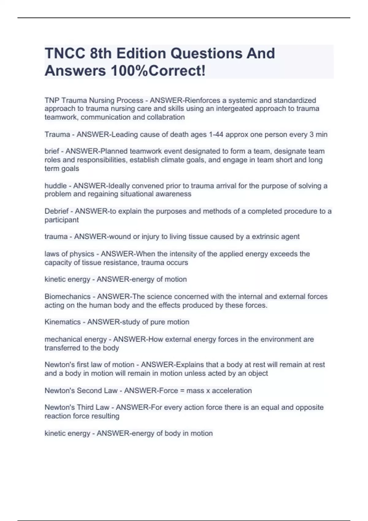 TNCC 8th Edition Questions And Answers 100%Correct! TNP Trauma Nursing Process - ANSWER-Rienforces a systemic and standardized approach to trauma nursing care and skills using an intergeated approach to trauma teamwork, communication and collabration Trauma - ANSWER-Leading cause of death ages 1-44 approx one person every 3 min brief - ANSWER-Planned teamwork event designated to form a team, designate team roles and responsibilities, establish climate goals, and engage in team short and long term goals huddle - ANSWER-Ideally convened prior to trauma arrival for the purpose of solving a problem and regaining situational awareness Debrief - ANSWER-to explain the purposes and methods of a completed procedure to a participant trauma - ANSWER-wound or injury to living tissue caused by a extrinsic agent laws of physics - ANSWER-When the intensity of the applied energy exceeds the capacity of tissue resistance, trauma occurs kinetic energy - ANSWER-energy of motion Biomechanics - ANSWER-The science concerned with the internal and external forces acting on the human body and the effects produced by these forces. Kinematics - ANSWER-study of pure motion mechanical energy - ANSWER-How external energy forces in the environment are