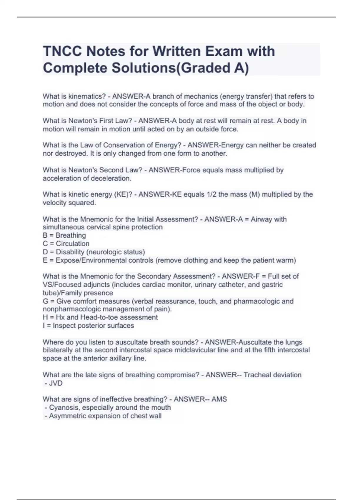 TNCC Notes for Written Exam with Co What is kinematics? - ANSWER-A branch of mechanics (energy transfer) that refers to motion and does not consider the concepts of force and mass of the object or body. What is Newton's First Law? - ANSWER-A body at rest will remain at rest. A body in motion will remain in motion until acted on by an outside force. What is the Law of Conservation of Energy? - ANSWER-Energy can neither be created nor destroyed. It is only changed from one form to another. What is Newton's Second Law? - ANSWER-Force equals mass multiplied by acceleration of deceleration. What is kinetic energy (KE)? - ANSWER-KE equals 1/2 the mass (M) multiplied by the velocity squared. What is the Mnemonic for the Initial Assessment? - ANSWER-A = Airway with simultaneous cervical spine protection B = Breathing C = Circulation D = Disability (neurologic status) E = Expose/Environmental controls (remove clothing and keep the patient warm) What is the Mnemonic for the Secondary Assessment? - ANSWER-F = Full set of VS/Focused adjuncts (includes cardiac monitor, urinary catheter, and gastric tube)/Family presence G = Give comfort measures (verbal reassurance, touch, and pharmacologic and nonpharmacologic management of pain). H = Hx and Head-to-toe assessment I = Inspect posterior surfaces mplete Solutions(Graded A)