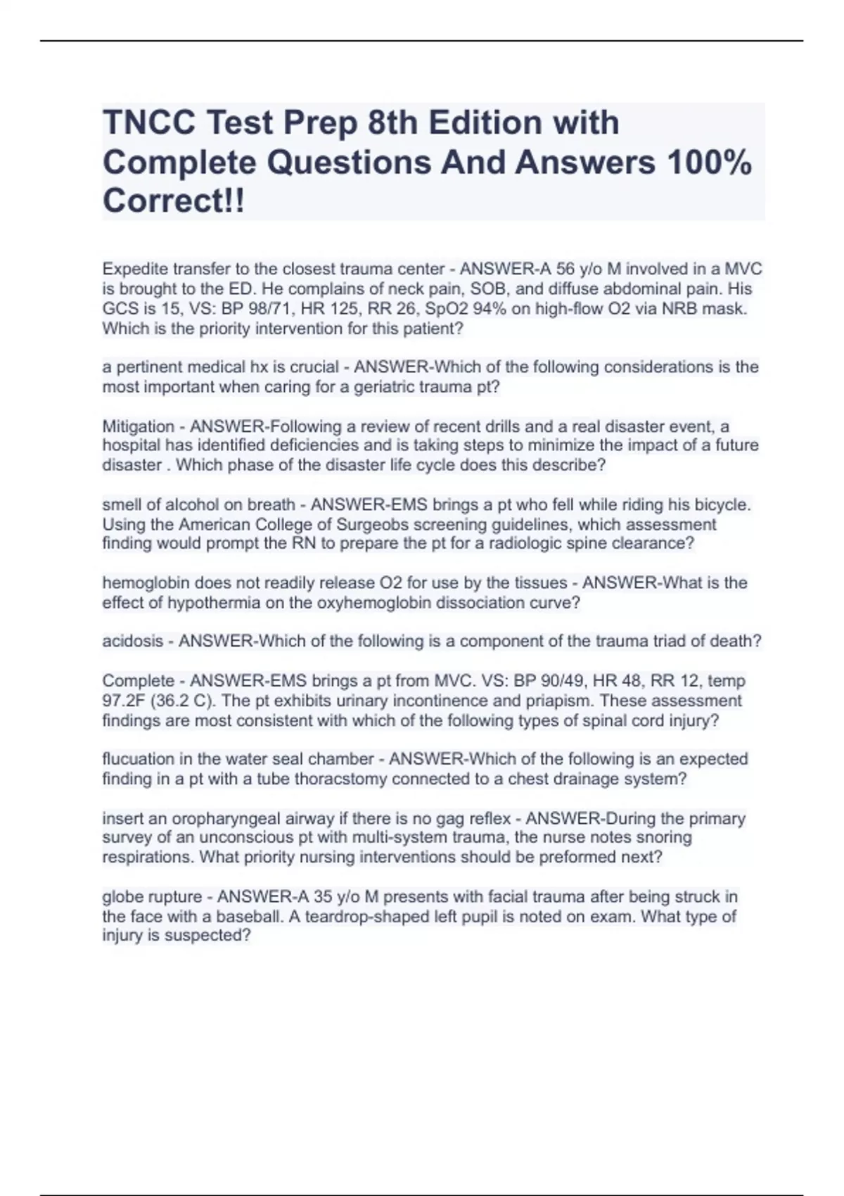 TNCC Test Prep 8th Edition with Complete Questions And Answers 100% Correct!! Expedite transfer to the closest trauma center - ANSWER-A 56 y/o M involved in a MVC is brought to the ED. He complains of neck pain, SOB, and diffuse abdominal pain. His GCS is 15, VS: BP 98/71, HR 125, RR 26, SpO2 94% on high-flow O2 via NRB mask. Which is the priority intervention for this patient? a pertinent medical hx is crucial - ANSWER-Which of the following considerations is the most important when caring for a geriatric trauma pt? Mitigation - ANSWER-Following a review of recent drills and a real disaster event, a hospital has identified deficiencies and is taking steps to minimize the impact of a future disaster . Which phase of the disaster life cycle does this describe? smell of alcohol on breath - ANSWER-EMS brings a pt who fell while riding his bicycle. Using the American College of Surgeobs screening guidelines, which assessment finding would prompt the RN to prepare the pt for a radiologic spine clearance? hemoglobin does not readily release O2 for use by the tissues - ANSWER-What is the effect of hypothermia on the oxyhemoglobin dissociation curve? acidosis - ANSWER-Which of the following is a component of the trauma triad of death? Complete - ANSWER-EMS brings a pt from MVC. VS: BP 90/49, HR 48, RR 12, temp 97.2F (36.2 C). The pt exhibits urinary incontinence and priapism. These assessment findings are most consistent with which of the following types of spinal cord injury? flucuation in the water seal chamber - ANSWER-Which of the following is an expected finding in a pt with a tube thoracstomy connected to a chest drainage system?