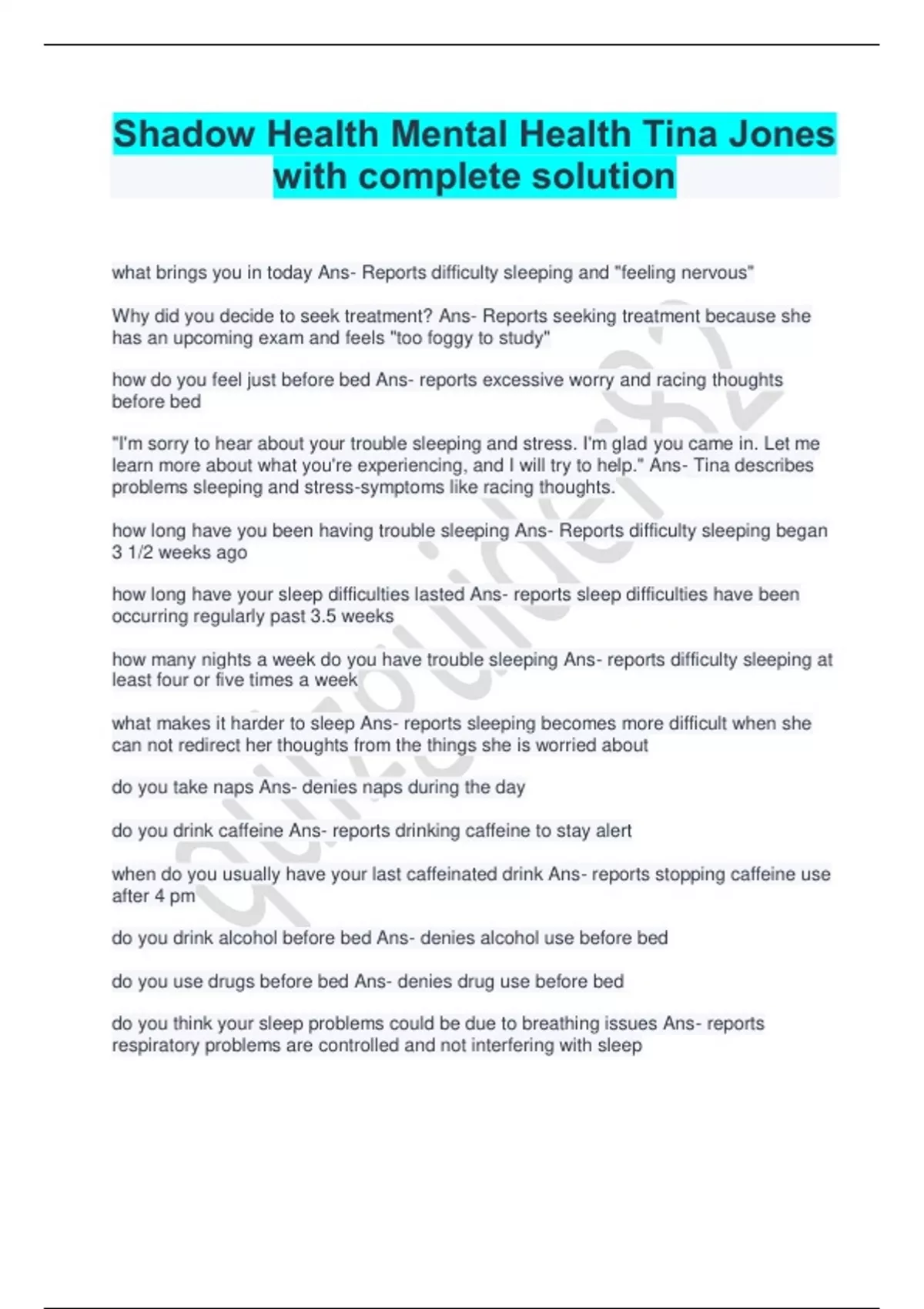 Shadow Health Mental Health Tina Jones with complete solution what brings you in today Ans- Reports difficulty sleeping and "feeling nervous" Why did you decide to seek treatment? Ans- Reports seeking treatment because she has an upcoming exam and feels "too foggy to study" how do you feel just before bed Ans- reports excessive worry and racing thoughts before bed "I'm sorry to hear about your trouble sleeping and stress. I'm glad you came in. Let me learn more about what you're experiencing, and I will try to help." Ans- Tina describes problems sleeping and stress-symptoms like racing thoughts. how long have you been having trouble sleeping Ans- Reports difficulty sleeping began 3 1/2 weeks ago how long have your sleep difficulties lasted Ans- reports sleep difficulties have been occurring regularly past 3.5 weeks how many nights a week do you have trouble sleeping Ans- reports difficulty sleeping at least four or five times a week what makes it harder to sleep Ans- reports sleeping becomes more difficult when she can not redirect her thoughts from the things she is worried about do you take naps Ans- denies naps during the day do you drink caffeine Ans- reports drinking caffeine to stay alert when do you usually have your last caffeinated drink Ans- reports stopping caffeine use after 4 pm do you drink alcohol before bed Ans- denies alcohol use before bed do you use drugs before bed Ans- denies drug use before bed do you think your sleep problems could be due to breathing issues Ans- reports respiratory problems are controlled and not interfering with sleepwhat helps you sleep Ans- reports sleeping more easily if she can distract herself from her racing thoughts do you exercise Ans- reports no exercise how does your lack of sleep affect your daily life Ans- reports feeling tired and out of it most of the time during the day due to lack of sleep have you been falling asleep when you didnt mean to Ans- reports no increased chance of drifting off during the day despite lack of sleep what do you mean when you say you feel out of it Ans- reports feeling slowed down and tired, having trouble focusing, and generally feeling less sharp can you tell me about how your anxiety feels Ans- reports feelings of anxiety as thoughts she cant turn off and being on edge do you ever have a sense of impending doom Ans- reports worry about the future but no sense of impending doom have you been having panic attacks Ans- reports no panic attacks have you been having trouble concentrating Ans- reports difficulty concentrating due to fatigue from lack of sleep do you feel restless Ans- reports only restlessness occurs just before bed do you feel irritable Ans- reports slight irritability due to fatigue how does your anxiety interfere with your daily life Ans- reports stress only interferes with daily life because it interrupts her sleep how often do you awaken during the night Ans- reports waking up two or three times during the night for at least 10 minutes how do you feel when you wake up in the morning Ans- reports waking in the morning feeling out of it and not rested when do you go to bed Ans- reports going to bed around midnight but feeling too nervous to sleep when do you fall asleep Ans- reports actually falling asleep at 2 or 3 am