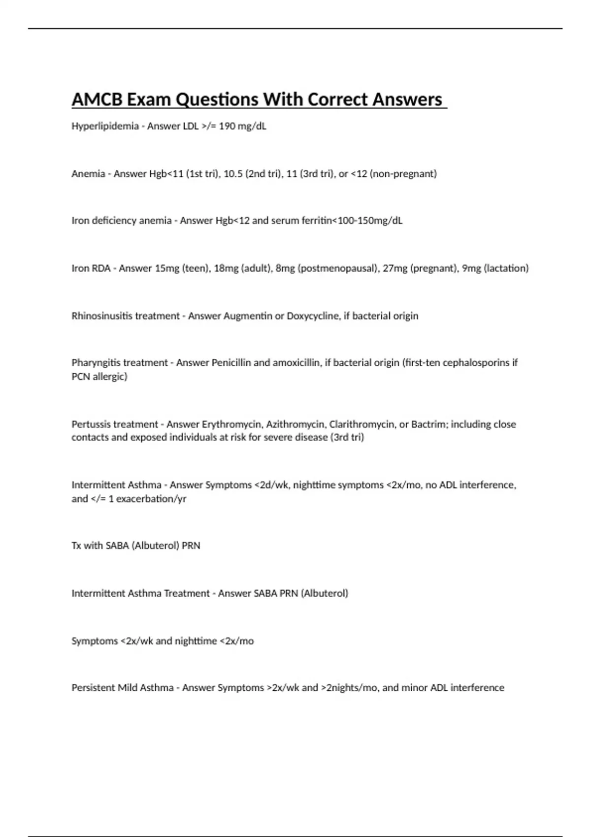 Hyperlipidemia - Answer LDL >/= 190 mg/dL Anemia - Answer Hgb<11 (1st tri), 10.5 (2nd tri), 11 (3rd tri), or <12 (non-pregnant) Iron deficiency anemia - Answer Hgb<12 and serum ferritin<100-150mg/dL Iron RDA - Answer 15mg (teen), 18mg (adult), 8mg (postmenopausal), 27mg (pregnant), 9mg (lactation) Rhinosinusitis treatment - Answer Augmentin or Doxycycline, if bacterial origin Pharyngitis treatment - Answer Penicillin and amoxicillin, if bacterial origin (first-ten cephalosporins if PCN allergic) Pertussis treatment - Answer Erythromycin, Azithromycin, Clarithromycin, or Bactrim; including close contacts and exposed individuals at risk for severe disease (3rd tri) Intermittent Asthma - Answer Symptoms <2d/wk, nighttime symptoms <2x/mo, no ADL interference, and </= 1 exacerbation/yr Tx with SABA (Albuterol) PRN Intermittent Asthma Treatment - Answer SABA PRN (Albuterol) Symptoms <2x/wk and nighttime <2x/mo Persistent Mild Asthma - Answer Symptoms >2x/wk and >2nights/mo, and minor ADL interference Tx with low dose ICS (Fluticasone, Budesonide) and SABA (Albuterol) PRN Persistent Mild Asthma Treatment - Answer Low-dose ICS (Fluticasone, Budesonide), and SABA (Albuterol) PRN Persistent Moderate Asthma - Answer Daily symptoms, and >1x/wk but not nightly, some ADL interference Tx with Low-dose ICS (Fluticasone, Budesonide) and LABA (Formoterol, Salmeterol)--Combos: Symbicort, Advair (and PRN SABA-Albuterol)