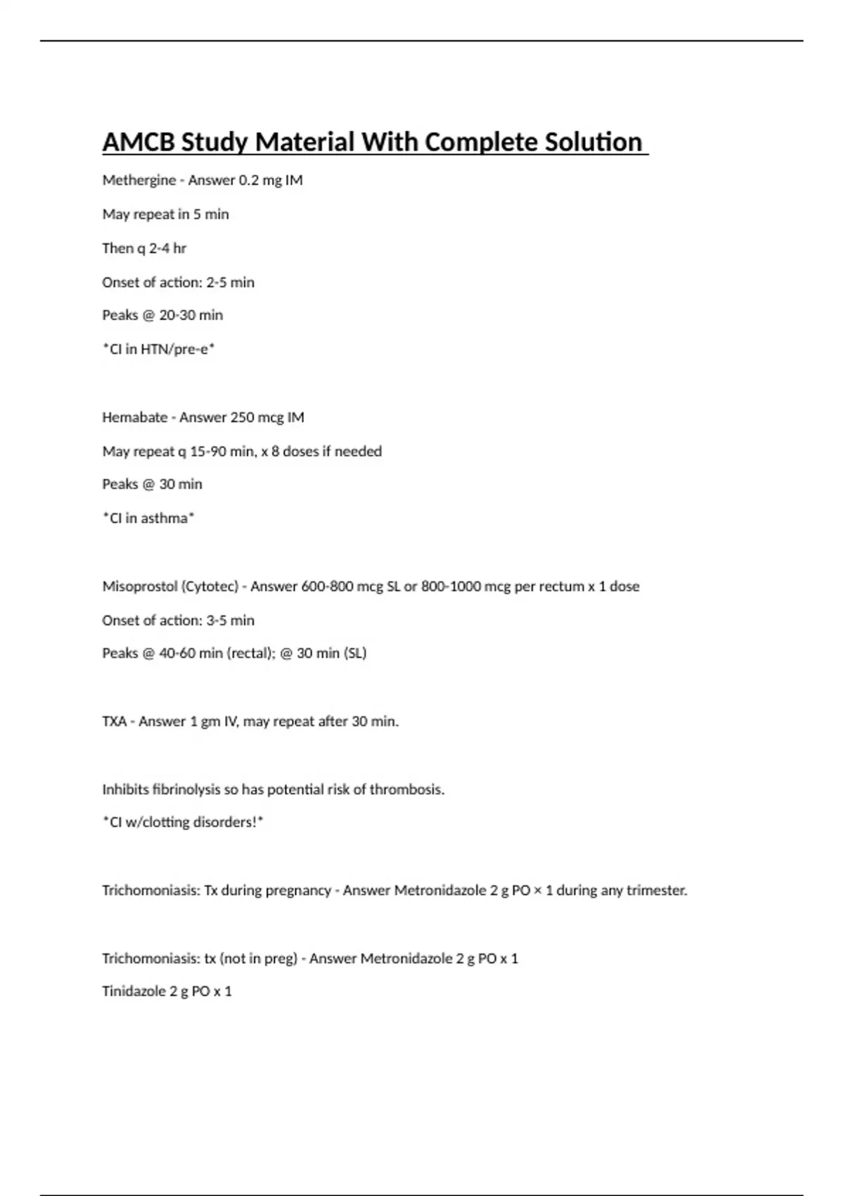 Methergine - Answer 0.2 mg IM May repeat in 5 min Then q 2-4 hr Onset of action: 2-5 min Peaks @ 20-30 min *CI in HTN/pre-e* Hemabate - Answer 250 mcg IM May repeat q 15-90 min, x 8 doses if needed Peaks @ 30 min *CI in asthma* Misoprostol (Cytotec) - Answer 600-800 mcg SL or 800-1000 mcg per rectum x 1 dose Onset of action: 3-5 min Peaks @ 40-60 min (rectal); @ 30 min (SL) TXA - Answer 1 gm IV, may repeat after 30 min. Inhibits fibrinolysis so has potential risk of thrombosis. *CI w/clotting disorders!* Trichomoniasis: Tx during pregnancy - Answer Metronidazole 2 g PO × 1 during any trimester. Trichomoniasis: tx (not in preg) - Answer Metronidazole 2 g PO x 1 Tinidazole 2 g PO x 1 or Metronidazole 500 mg PO BID x 7 days Bacterial Vaginosis: Tx during pregnancy - Answer Metronidazole 500 mg PO BID x 7 days or Metro gel 0.75% vag suppos @ hs x 5 days Other alternatives: Tinidazole 2 g PO x 2 days Tinidazole 1 g PO x 5 days Clindamycin 300 mg PO BID x 7 days Clindamycin ovules 100 mg intravaginally @ hs x 3 days Vulvovaginal candidiasis - Answer Fluconazole 150 mg PO x 1 *(avoid in pregnancy)* Rx intravaginal: Butoconazole, terconazole OTC intravaginal: Clotrimazole, miconazole, tioconazole Chlamydia: Tx (not in pregnancy) - Answer Azithromycin 1 g PO x 1 or Doxycycline 100 mg PO BID x 7 days or Erythromycin 500 mg PO QID x 7 days Chlamydia: Tx in pregnancy - Answer Azithromycin 1 g PO x 1 Amoxicillin 500 mg PO TID x 7 days Erythromycin 500 mg PO QID x 7 days Doxyclycline= CI in pregnancy Condyloma Acuminata/Anogenital Warts: Tx in pregnancy - Answer Wart removal may be considered Imiquimod=low risk but should be avoided d/t scarcity of data Podofilox, podophyllin, sinetechins should be avoided! Provider administered tx of warts/HPV - Answer -Cryotherapy w/liquid nitrogen- repeat 1-2 weeks x 6 wks -Surgical removal w/tangential shave excision, curretage, laser, or electrosurgery -Trichloracetic or bichloroacetic acid Patient applied treatment for warts/HPV - Answer (use only on external warts) -Imiquimod 3.75%-5% cream-- safety in preg unknown -Podofilox 0.5% gel/sol'n--safety in preg unknown -Sinecatechins 15% ointment Firstline Tx for BP >160/110 - Answer Labetalol Hydralazine Nifedipine *Sodium nitroprusside when HTN resistant to other meds--admin by anesthesia, MFM, etc* AP tx of HIV positive pt - Answer HAART 1. Two nucleoside analogues (zidovudine, didanosine, zalcitabine, or lamivudine) -AND- 2. Protease inhibitor (indinavir, ritonavir, etc) *Start after first tri unless need tx now* # of days after birth it can take for sx's of drug withdrawal in neonates to develop - Answer 14 days Tell me about parvovirus - Answer Parvovirus spreads through respiratory secretions, such as saliva, sputum, or nasal mucus; when an infected person coughs or sneezes; through blood or blood products; and vertically from pregnant person to infant. There is no cure/treatment Most common complication: cholestasis of pregnancy - Answer -occurs in 2nd/3rd tri usually -char. by pruritus and elevation in serum bile acid conc. -onset-- dev of pruritus- may be intolerable; often generalized but predominates on palms and soles of the feet and is worse at night. HIV testing - Answer Antibody testing: 1. screening- EIA or ELISA (checks for proteins the body makes in presence of HIV 2. CDC no longer recommends Western Blot as form of confirmation testing Direct Viral Screens 1. Nucleic acid testing if suspect acute retrovirus syndrome or recent infection 2. Confirm w/subsequent ab testing to document seroconversion TORCH infections - Answer Toxoplasmosis Other Rubella Cytomegalovirus Herpes When is cervical cerclage performed? - Answer 12-24 weeks (some say 16-24 weeks) CL < 20 mm Makena - Answer IM- indicated with HISTORY OF PTB MagSO for fetal neuroprotection @ what gestation? - Answer 24-32w Tocolytics & steroids @ what gestation? - Answer 24-34w When is the presence of FFN normal? - Answer Before 20w and after 37w Vaginal progesterone - Answer @ 16-37 weeks CL < 25 mm (and intact membranes) In the second stage of labor, how frequently should the blood pressure of low-risk women be checked? - Answer Every 15 min Hyperemesis Gravidarum: r/f - Answer Dx of exclusion r/f= poss genetic link, motion sickness, migraines HG: dx criteria - Answer Severe/intractable vomiting, unknown etiology, wt loss of at least 5% of pre-preg wt; ketonuria, e-lyte imb, thyroid and liver abn HG: mgmt/tx - Answer Ginger 1 g/day in divided doses Pyridoxine (B6) 10-25 mg qid or tid (max 200 mg/day) Diclegis (pyridoxine 10 mg + doxylamine 10 mg) Metoclopramide 5-10 mg q 6-8 hrs Promethazine 25 mg q4h rectal suppos Ondansetron Normal MCV - Answer 80-100 Normal RBC - Answer 4-6 million Normal transferrin in first trimester - Answer 254-344 mg/dL hemodynamic changes during the initial postpartum period include: A) elevated cardiac output for as long as 48 hours after the birth. B) decreased white blood count (WBC) during the first 72 hours after the birth. C) elevated blood pressure for 48 hours after the birth. D) decreased urine output for the first 24 hours after the birth. - Answer A) elevated cardiac output for as long as 48 hours after the birth. Presentation of gHTN - Answer New onset BP elevation after 20 WG, w/o proteinuria or severe features. ? Weeks of organogenesis - Answer 3rd-8th wk. By the end, *all major organs are formed except lungs* 4th week gestation - Answer partitioning of the heart, arm and leg buds formed, umbilical cord is "unsheathed" 6th week of gestation - Answer head is larger than body. the heart is 100% formed. fingers and toes present. 12th week of gestation - Answer uterus palpable @ symph pubus, fetus making spontaneous movements 16th week of gestation - Answer can see sex on usn 28th week of gestation - Answer EFW 1100 g; 90% survival rate oligohydramnios: AFI and max deepest vert pocke - Answer AFI<5 -or- max deepest vertical pocket <2 cm Maternal causes of oligo - Answer uteroplacental insufficiency HTN DM