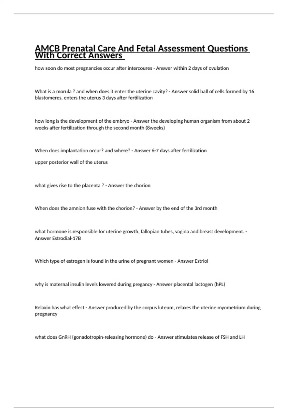 AMCB Prenatal Care And Fetal Assessment Questions With Correct Answers