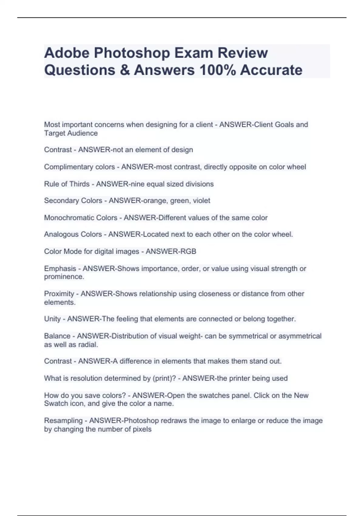 Adobe Photoshop Exam Review Questions & Answers 100% Accurate Adobe Photoshop Exam Review Questions & Answers 100% Accurate Adobe Photoshop Exam Review Questions & Answers 100% Accurate Most important concerns when designing for a client - ANSWER-Client Goals and Target Audience Contrast - ANSWER-not an element of design Complimentary colors - ANSWER-most contrast, directly opposite on color wheel