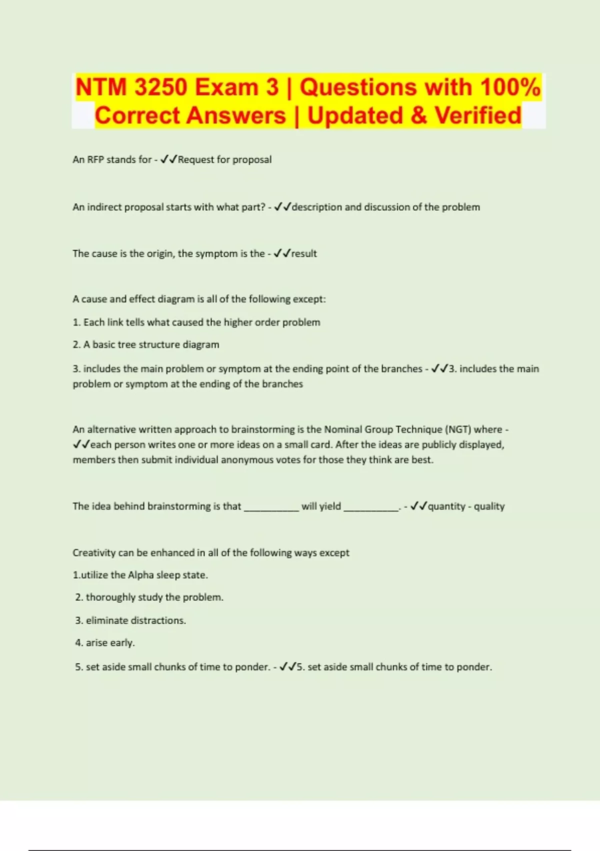 NTM 3250 Exam 3 | Questions with 100% Correct Answers | Updated & Verified An RFP stands for - Request for proposal An indirect proposal starts with what part? - description and discussion of the problem The cause is the origin, the symptom is the - result A cause and effect diagram is all of the following except: 1. Each link tells what caused the higher order problem 2. A basic tree structure diagram 3. includes the main problem or symptom at the ending point of the branches - 3. includes the main problem or symptom at the ending of the branches An alternative written approach to brainstorming is the Nominal Group Technique (NGT) where - each person writes one or more ideas on a small card. After the ideas are publicly displayed, members then submit individual anonymous votes for those they think are best. The idea behind brainstorming is that __________ will yield __________. - quantity - quality Creativity can be enhanced in all of the following ways except ze the Alpha sleep state. 2. thoroughly study the problem. 3. eliminate distractions. 4. arise early. 5. set aside small chunks of time to ponder. - 5. set aside small chunks of time to ponder. Gallery writing involves having group members write ideas on _____________________. - Large Sheets of Paper Moving toward one point and unifying the group is called __________ thinking. - convergent A decision table, or decision matrix, compares alternatives according to important __________ - criteria Which of the following is not one of the five M's of management resources? Morale Methods Machines Money Manpower Materials - Morale