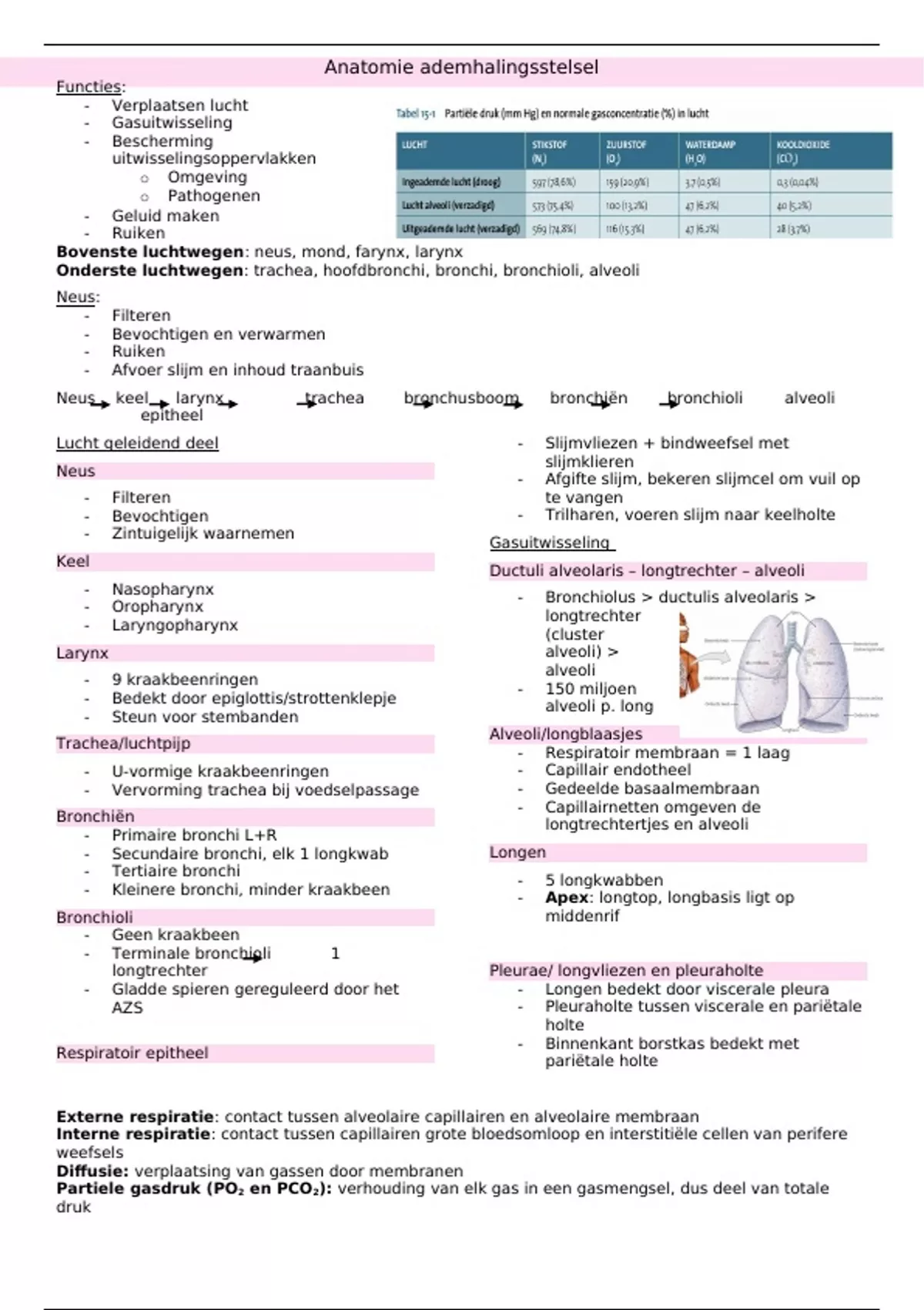 Onderste luchtwegen: trachea, hoofdbronchi, bronchi, bronchioli, alveoli