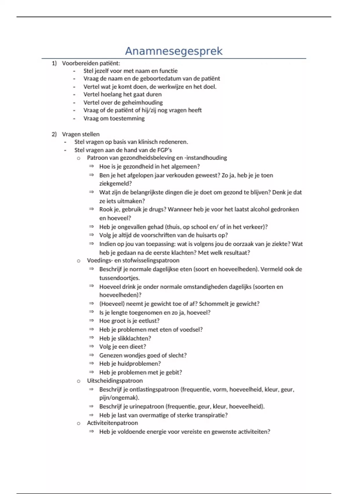 Dit document is goed te gebruiken bij het leren voor de performance assessment. Het bevat een beknopte uitleg over het voeren van een anamnese gesprek.